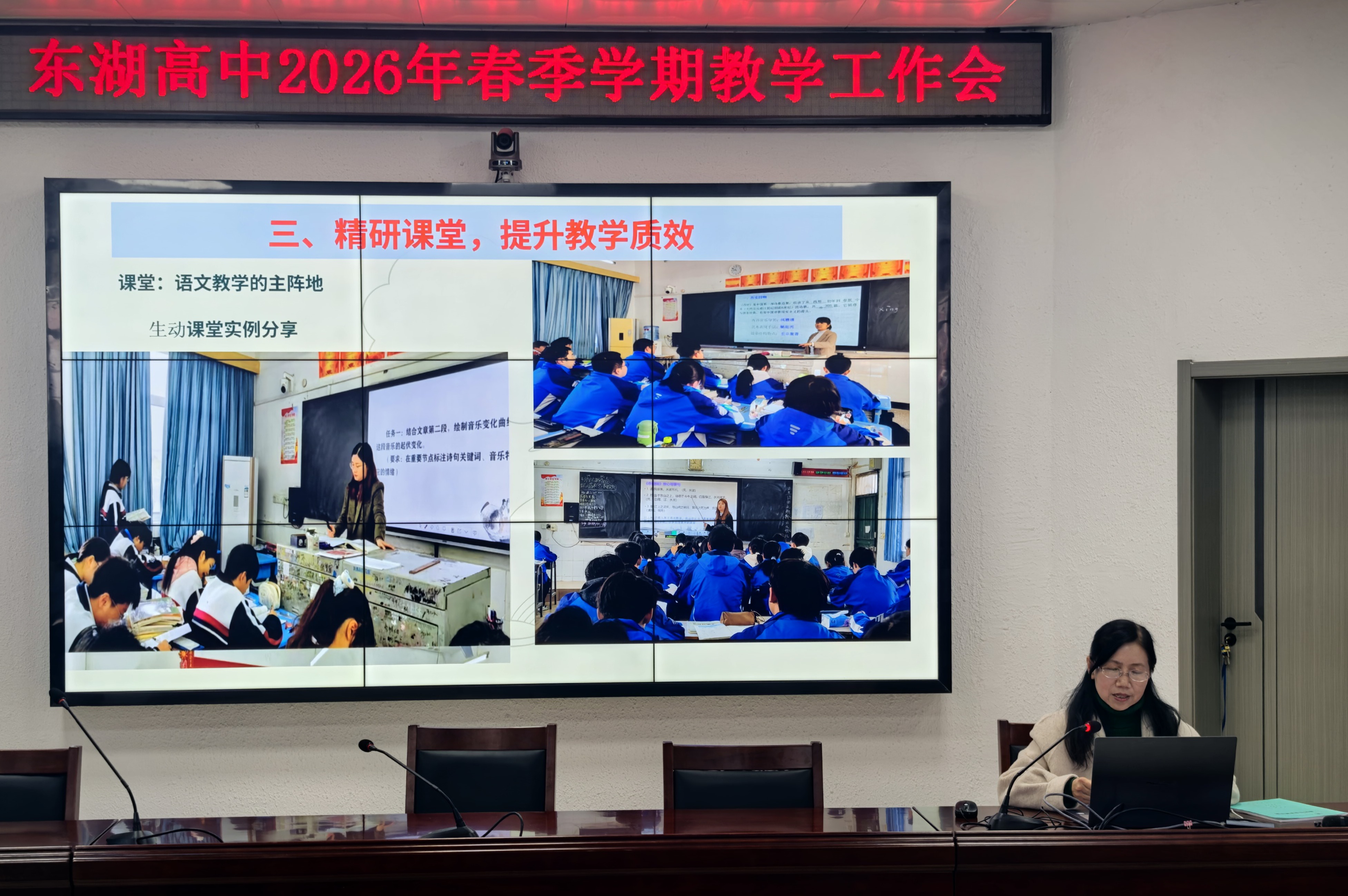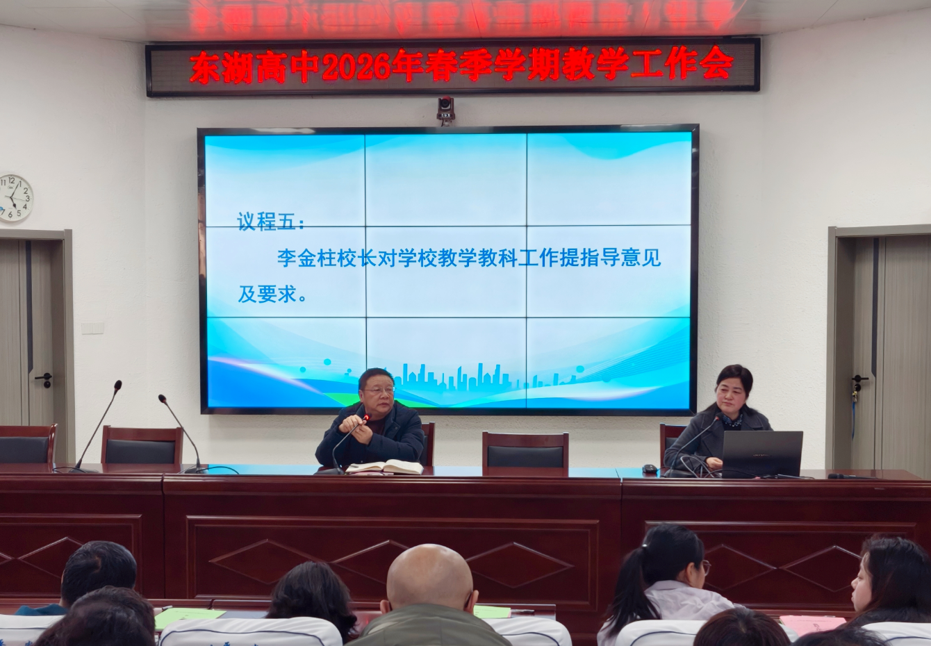 3月10日下午,东湖高中召开2026年春季学期教学工作会,围绕“守规范、重特色、提质量、赋动能、看融合”五大关键词,系统总结前期教学成果,科学部署新学期重点任务,推动学校育人质量持续提升。副校长刘昌桂主持会议,学校教学管理人员、全体教研组长及备课组长参会。