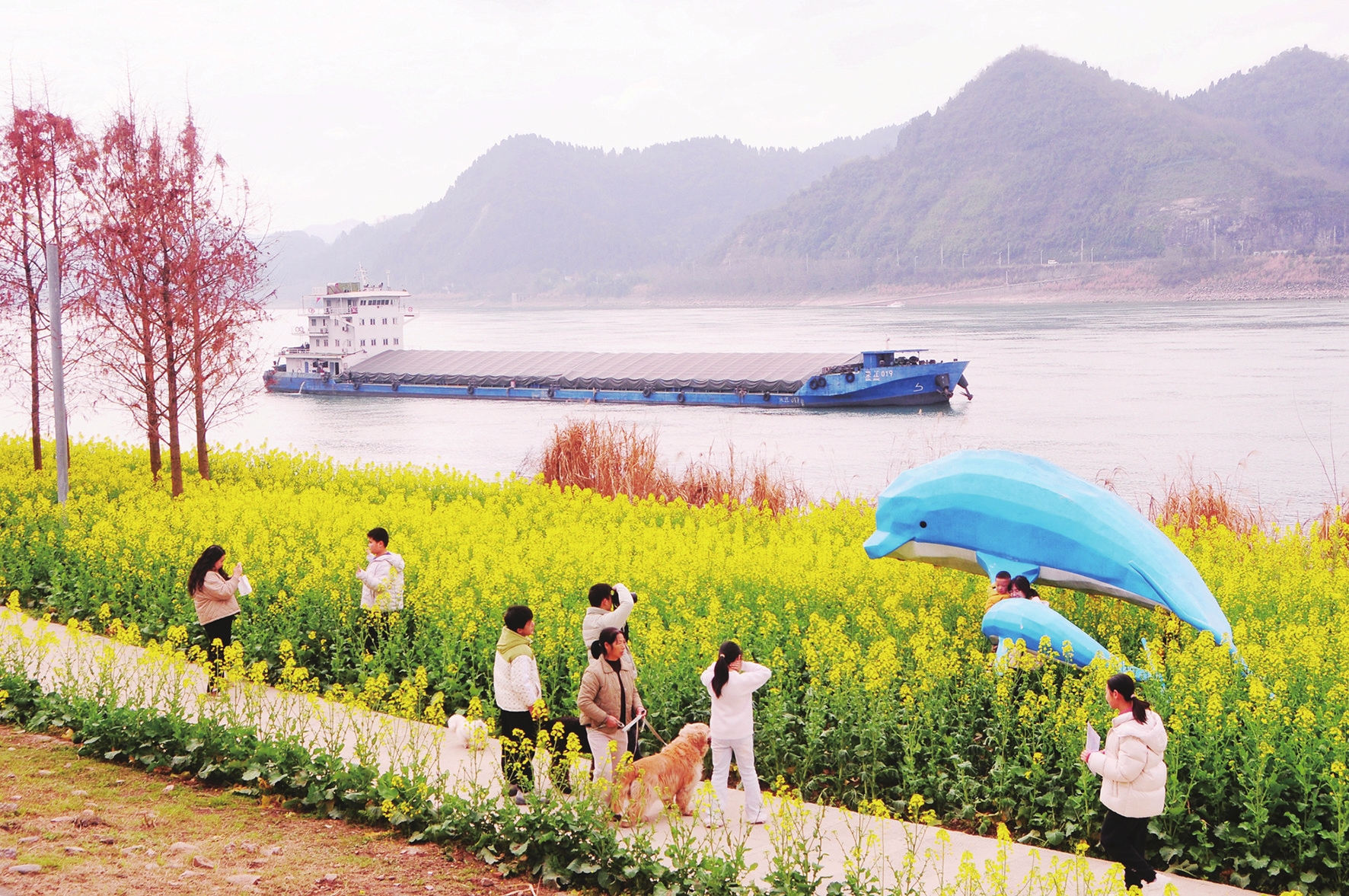 长江之畔,和平公园的油菜花沿江堤蜿蜒舒展,层层金黄与“江豚母子”雕塑相映成趣,勾勒出江岸独有的田园诗意。卷桥河湿地,虞美人与天人菊初绽芳容,织就绚烂花毯,与碧波共谱春日乐章。