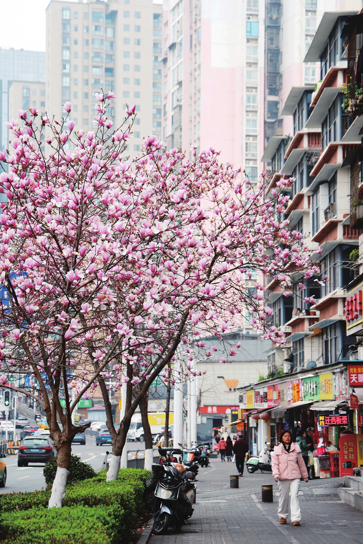 中南路道路旁玉兰盛放,白紫相间扮靓城市街头。(记者黄翔 摄)