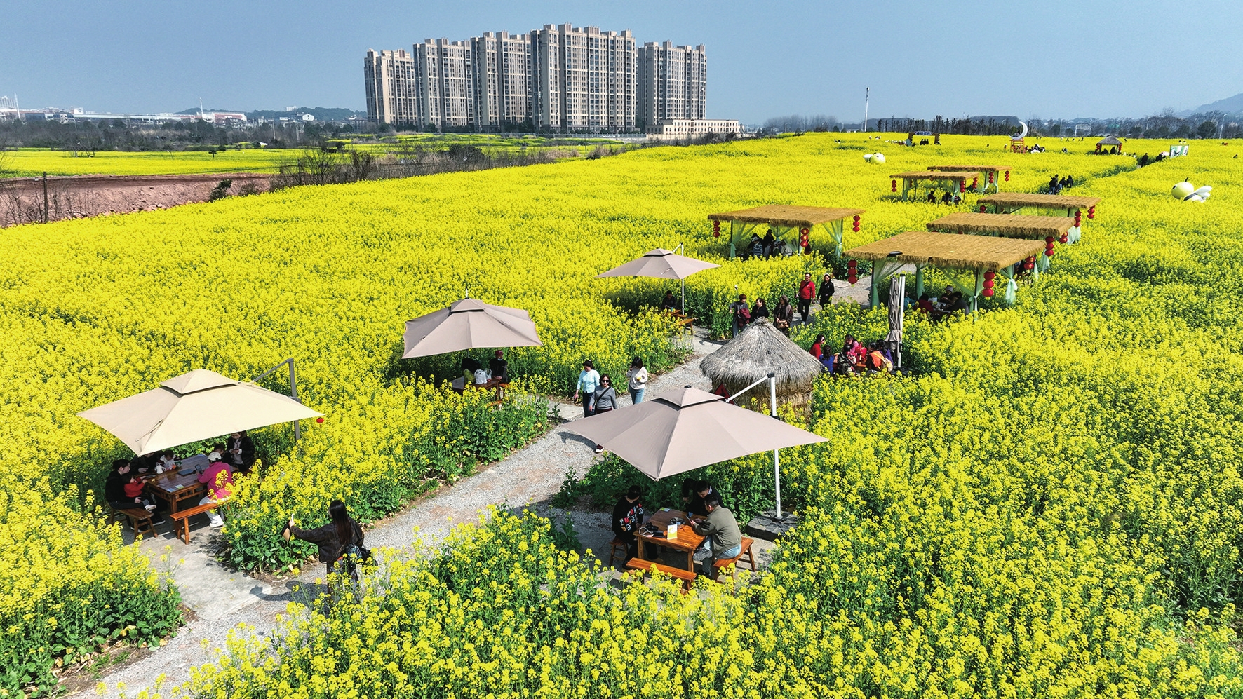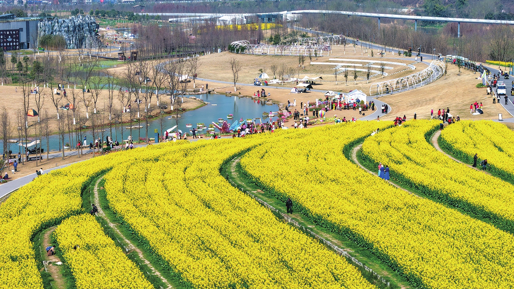 柏临河生态廊道近4万平方米油菜花迎来盛花期。满目金黄绵延起伏,碧水蓝天相映,绘就一幅春日画卷。 (记者林潇、通讯员张劲超 摄)