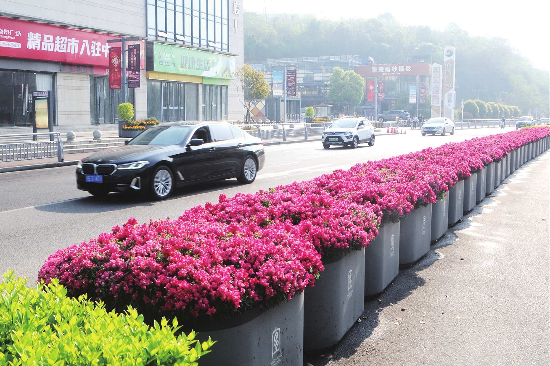 桔城路上的隔离带鲜花绽放,变身“流动的花园”。(记者黄翔 摄)