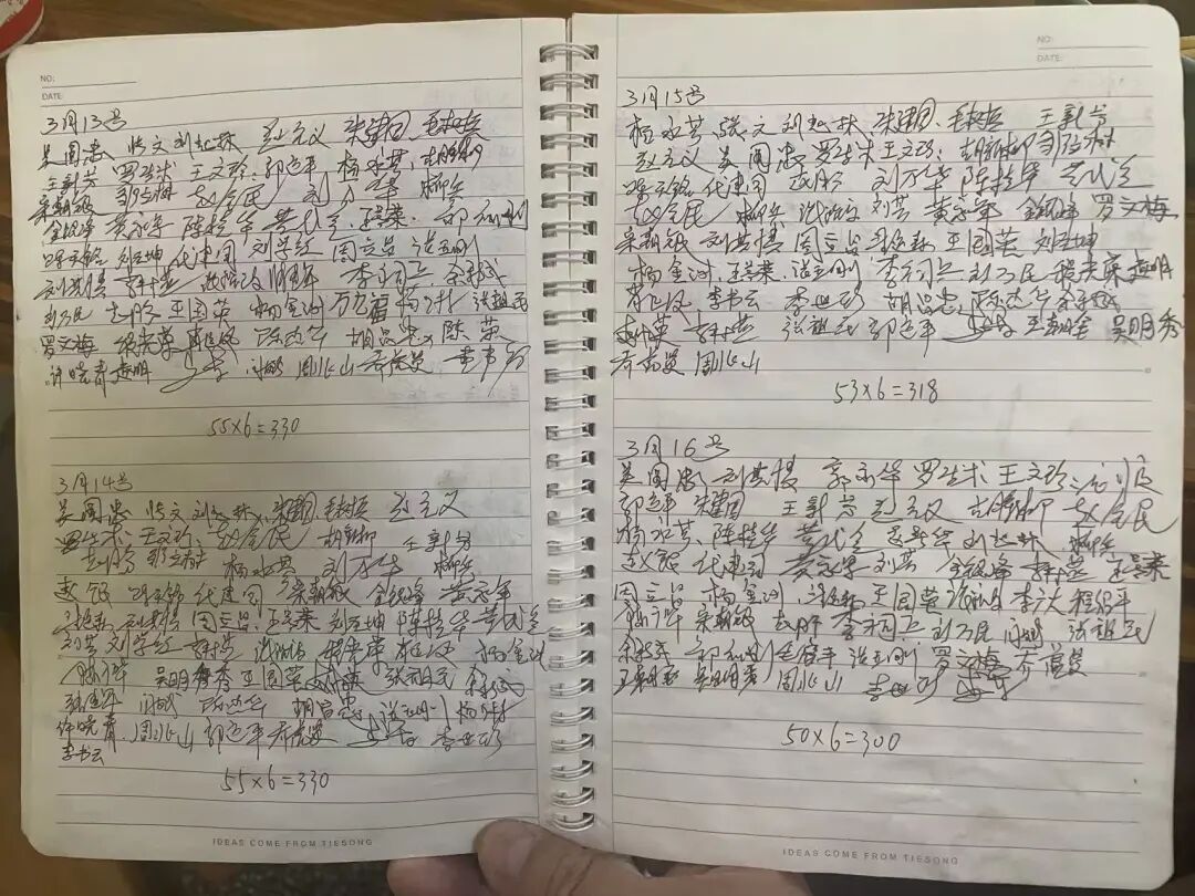 翻开账本,每天的记录中,“吴国忠”的名字常常签在第一个。