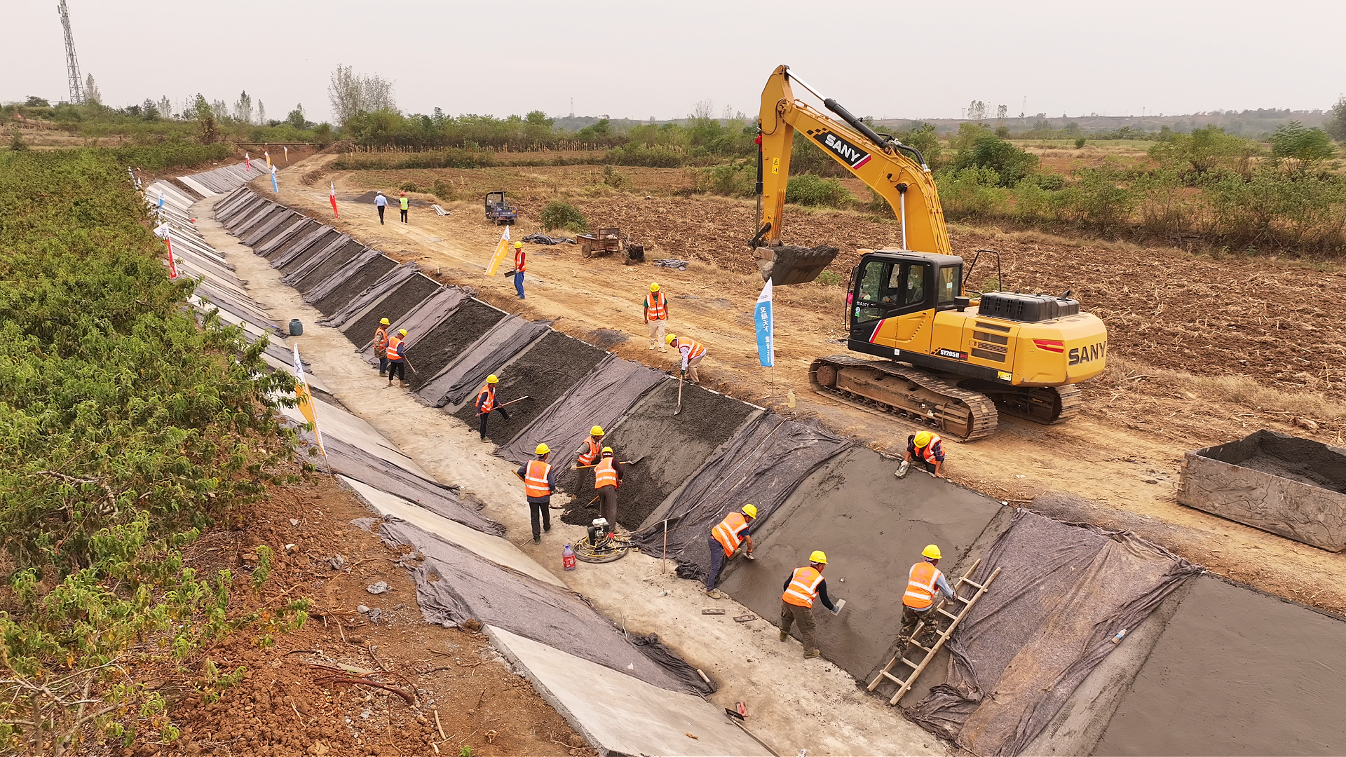 莺河二库灌区硬化渠道施工现场
