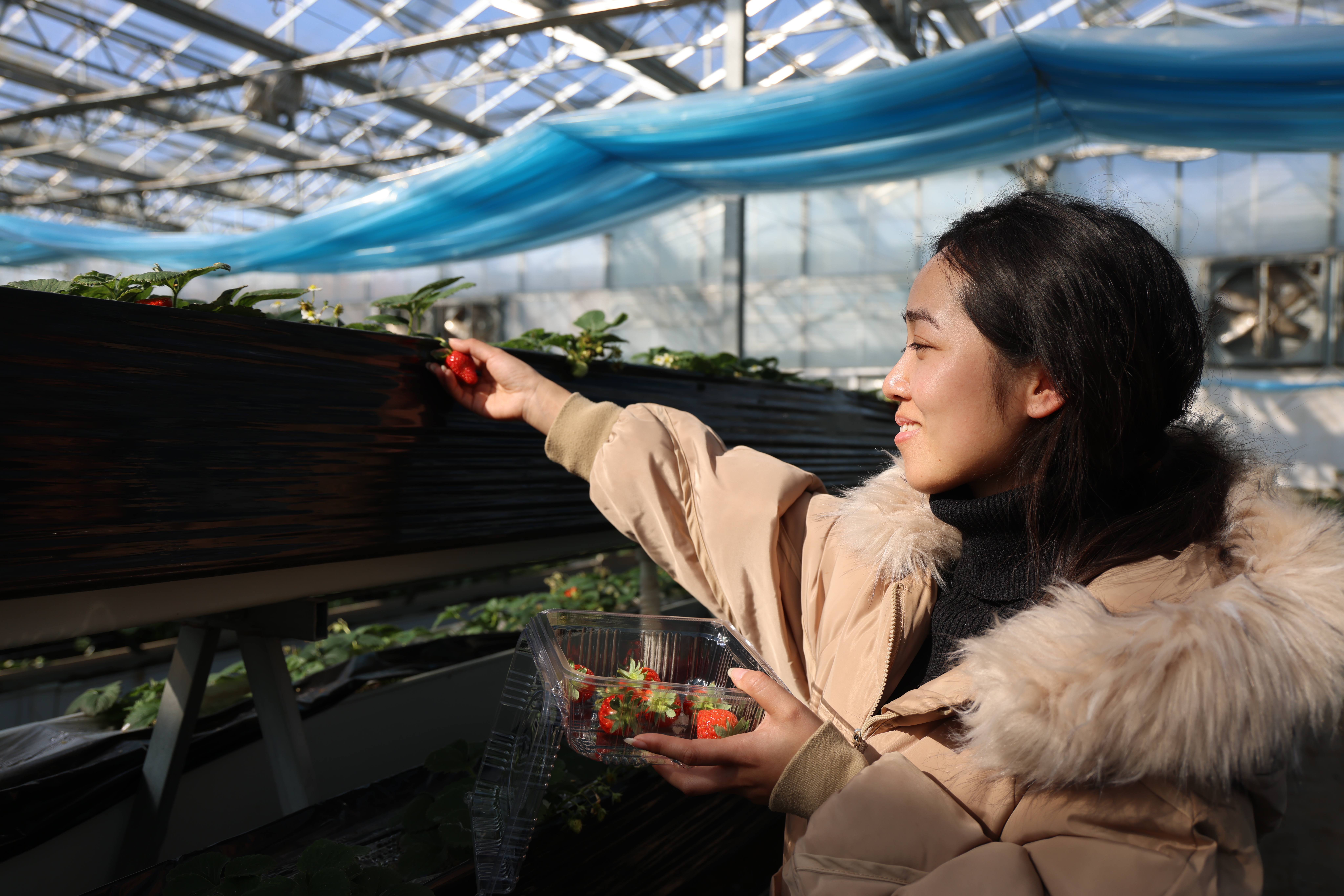 游客在莺河体验草莓采摘