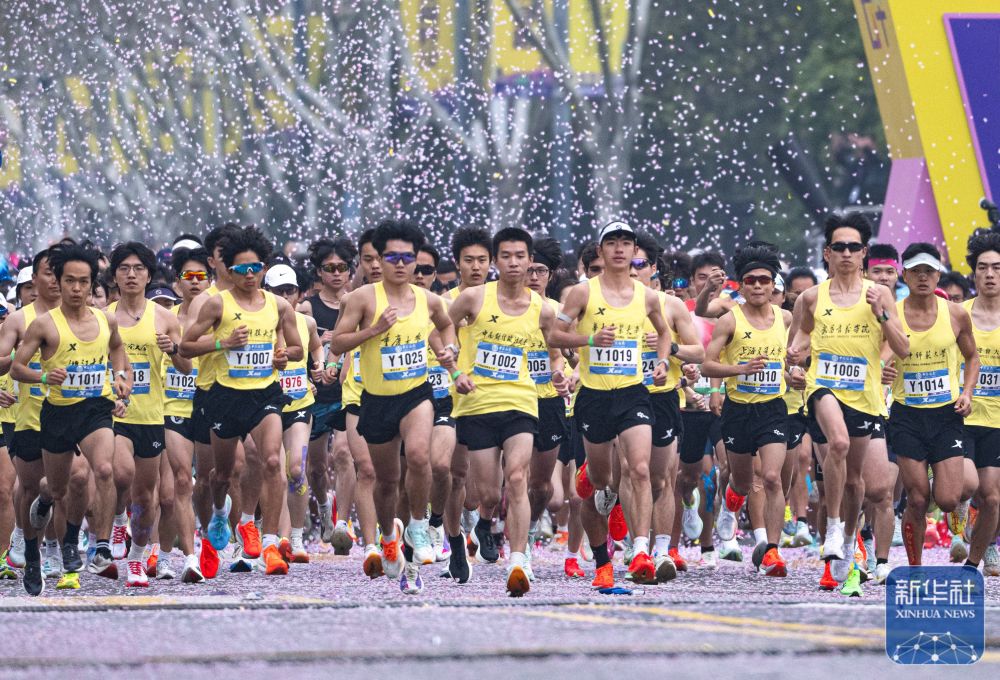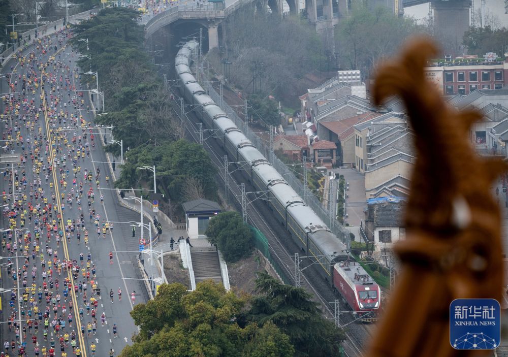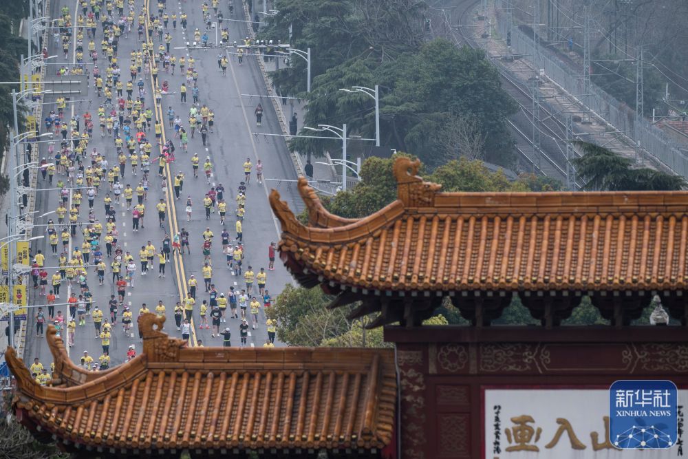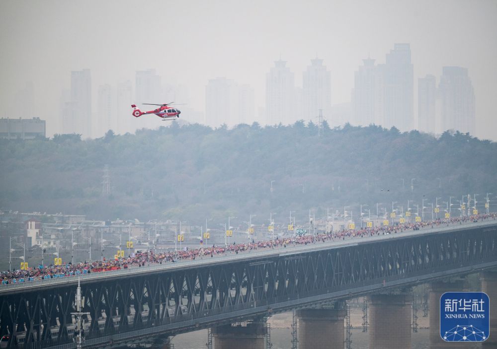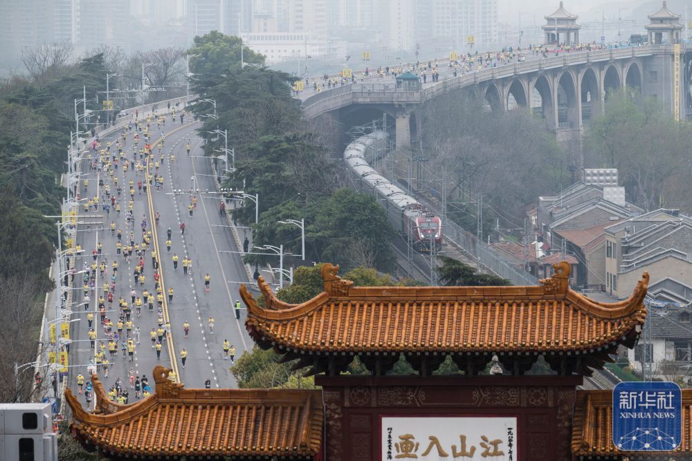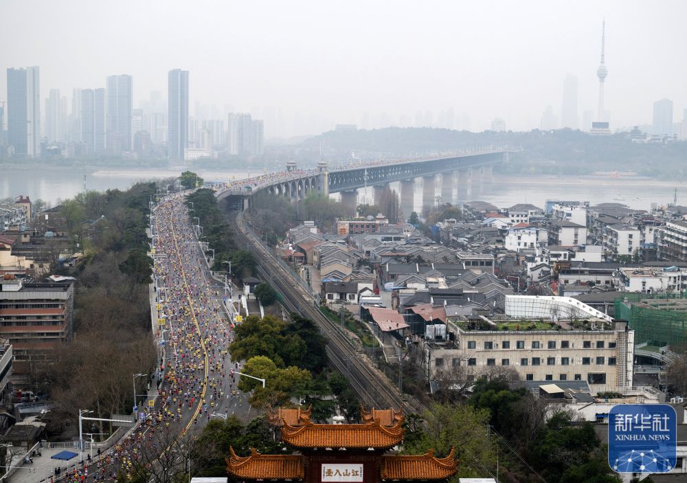 ↑ 参赛选手经过黄鹤楼。新华社记者 伍志尊 摄