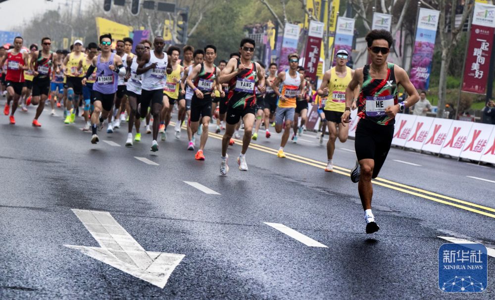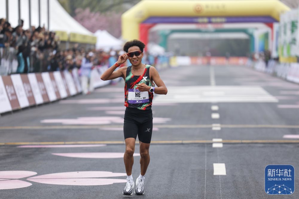 ↑ 肯尼亚选手穆鲁里到达终点,最终他以2小时10分16秒获得男子组冠军。新华社记者 肖艺九 摄