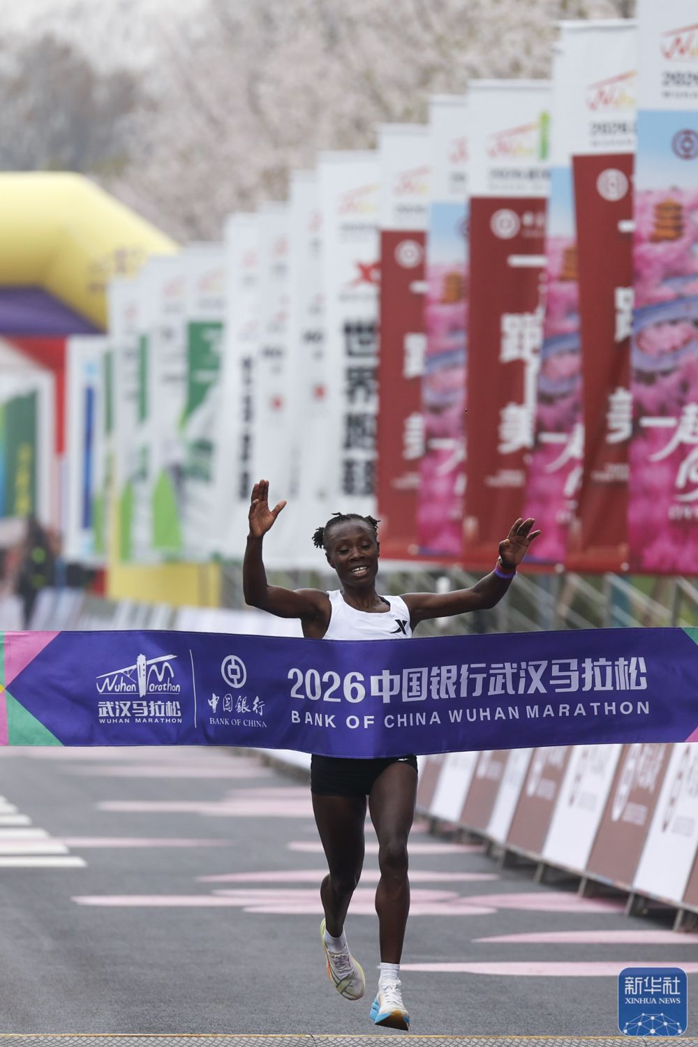 ↑ 肯尼亚选手马伊纳到达终点,最终她以2小时24分14秒获得女子组冠军。新华社记者 肖艺九 摄