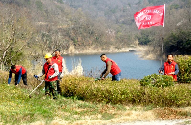 在三里岗村林家沟,另一种劳动场景呈现在眼前。这里地势更陡,临水更近,清理难度更大。村干部胡晓键带着几个人,几乎是半蹲在坡面上作业。他们修剪的不只是杂草,更是隐患——枯草易燃,一旦起火,紧邻的涵养林和水库将面临威胁。