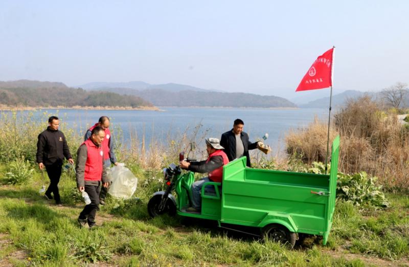 漳河水库马河镇三里岗村林家沟,“河伙人”志愿者正在“清扫家园”。