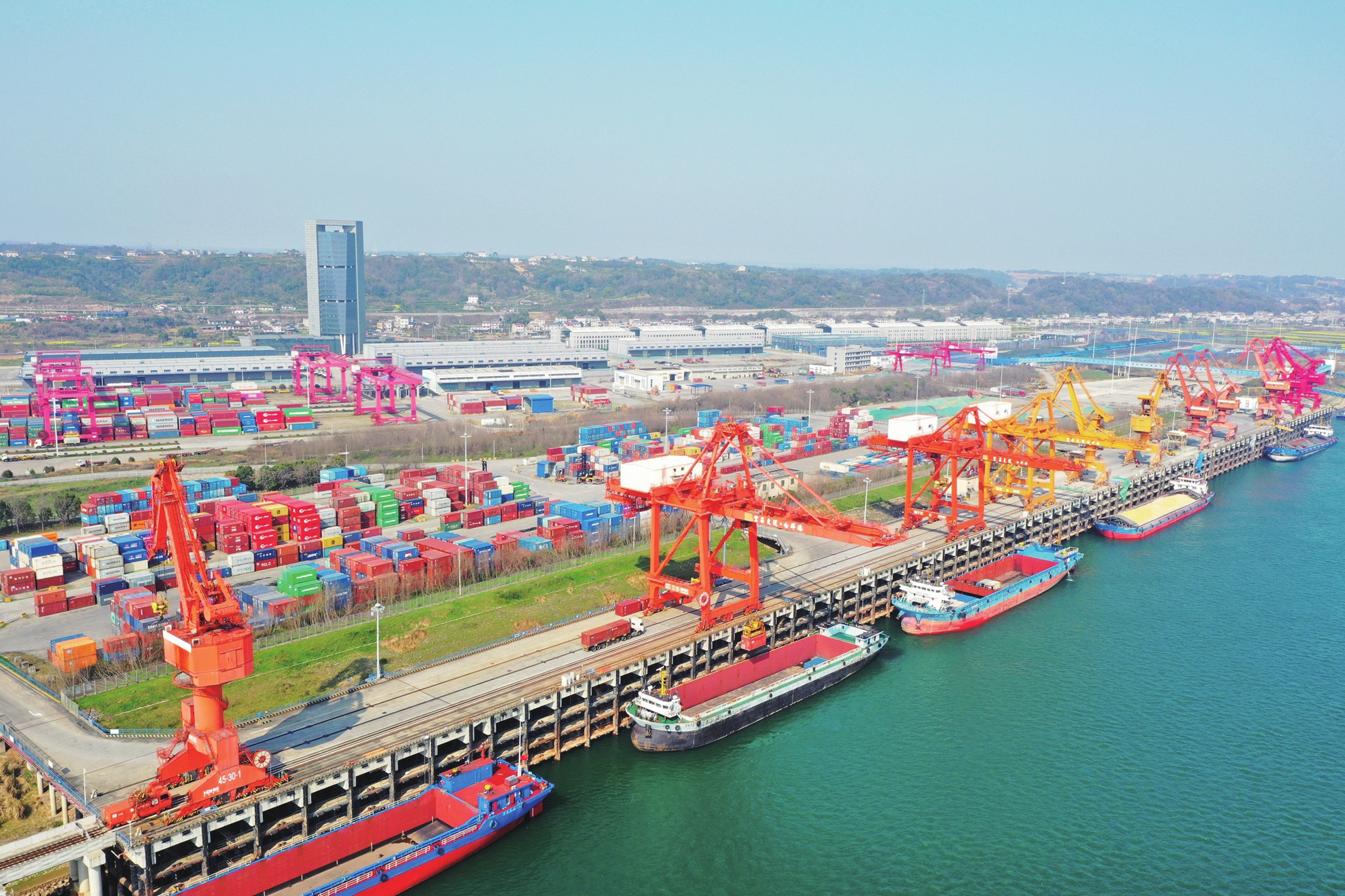 连日来,宜昌港务集团白洋港区紧抓船舶到港高峰机遇,港口生产热潮涌动、火力全开,生产运营全线飘红。截至目前,白洋港累计完成集装箱吞吐量3.2万标箱、散货吞吐量71.18万吨,生产经营实现首季“开门红”。图为3月20日白洋港区一角。(记者黄翔、通讯员李齐悦 摄)