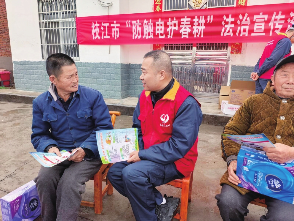 春分时节,枝江市司法局、应急管理局、经信商务局与国网枝江市供电公司开展政企联动,将“防触电、防外破”法治宣传送到田间地头、农家庭院,为春耕春灌安全用电护航。图为政企联动服务队成员在问安镇代家店村以“湾子会”形式向村民科普防触电应急知识、解读电力设施保护条例。(通讯员雷勇、孟丹)
