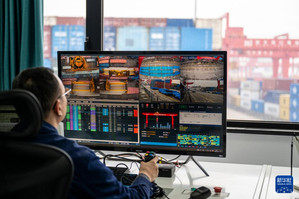 3月26日,武汉阳逻港远控室,工作人员在远程操作机械设备吊装集装箱。新华社记者 伍志尊 摄