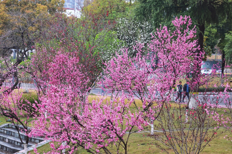 三峡大学校园内桃花盛开,粉红花海与求索溪畔风景相映成趣,美不胜收。 (记者黄翔 摄)