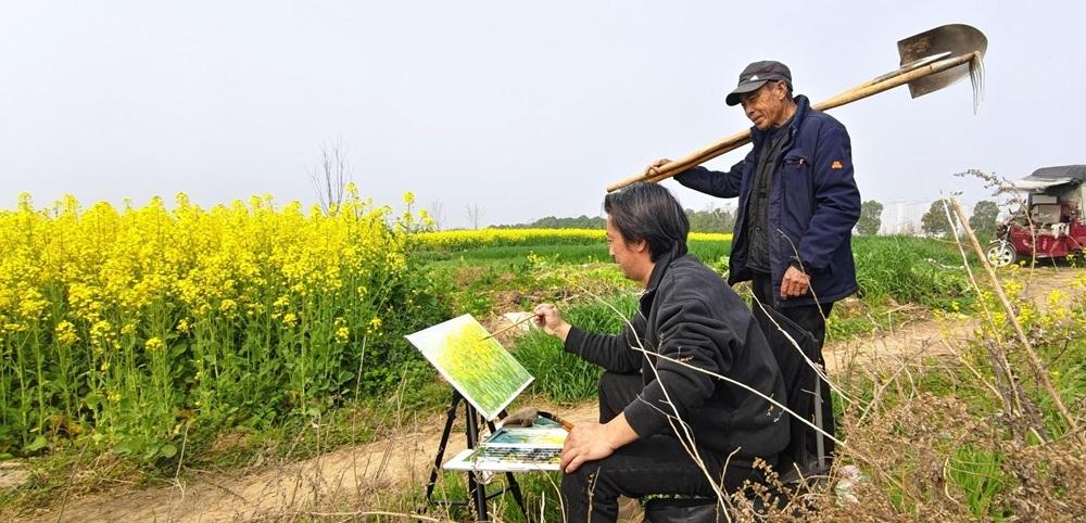其中有片油菜花地的主人是位老农,他扛着铁锹在旁边看画家写生,不时地点点头:“画得好,画得好!”不远处,一位网络主播正举着自拍杆,与粉丝分享花海的拍摄技巧;一位宝妈正在春风中起舞,并用手机对着自己录下跳舞的视频。