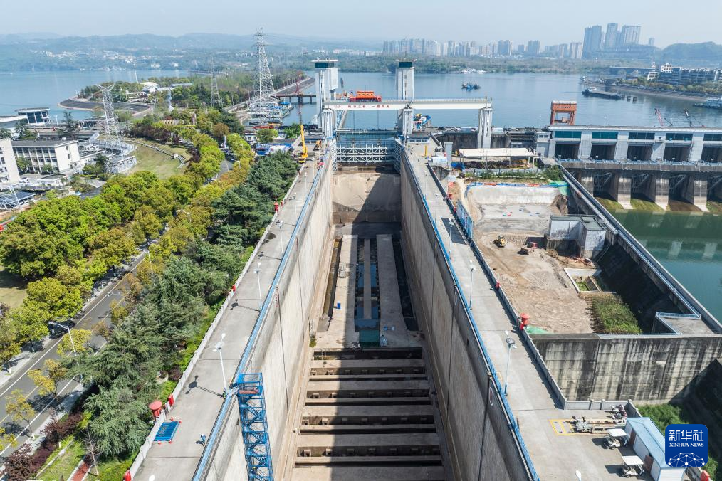 4月1日拍摄的葛洲坝二号船闸停航检修现场(无人机照片)。新华社记者 伍志尊 摄