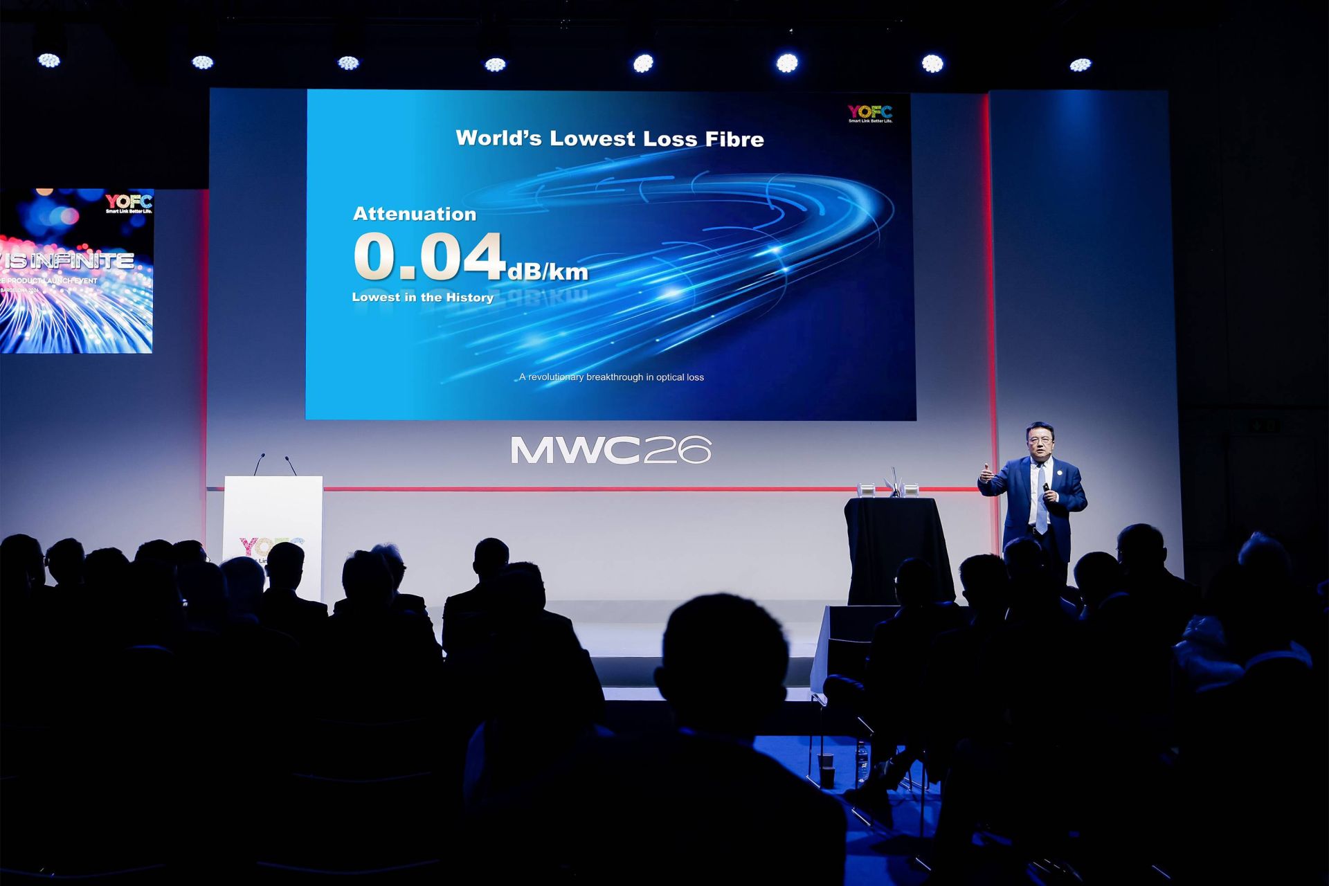 2026年世界移动通信大会(MWC2026)上,长飞光纤发布全球最低衰减0.04dB/km空芯光纤