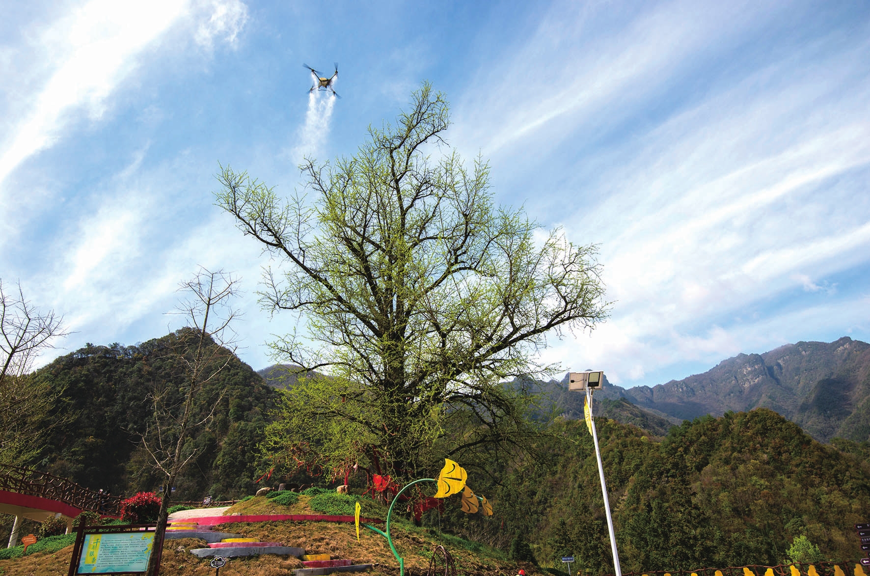 4月3日,太平洋财产保险秭归支公司聘请专人,用无人机为磨坪乡千年古银杏开展病虫害防治和施肥作业。今年,秭归林业部门为登记在册的487株古树,购买古树名木综合保险,由保险公司为古树更新复壮、安全隐患排除提供保障,让千年古树安享“专属守护”。(记者胡兴军、通讯员周仕伟 摄)