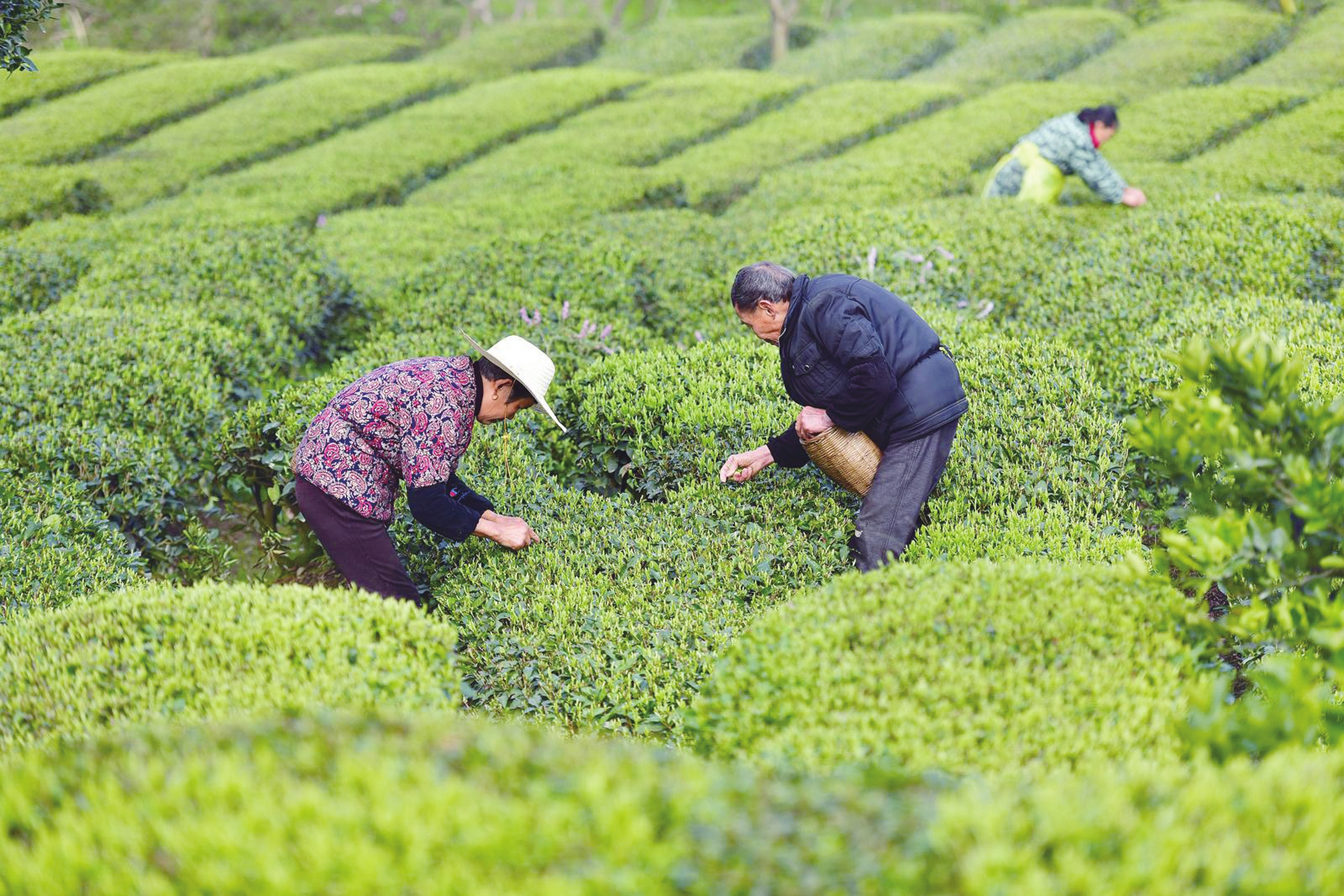 3月22日,茶农在秭归县茅坪镇松树坳村一生态茶园采摘“明前茶”。(通讯员王辉富 摄)