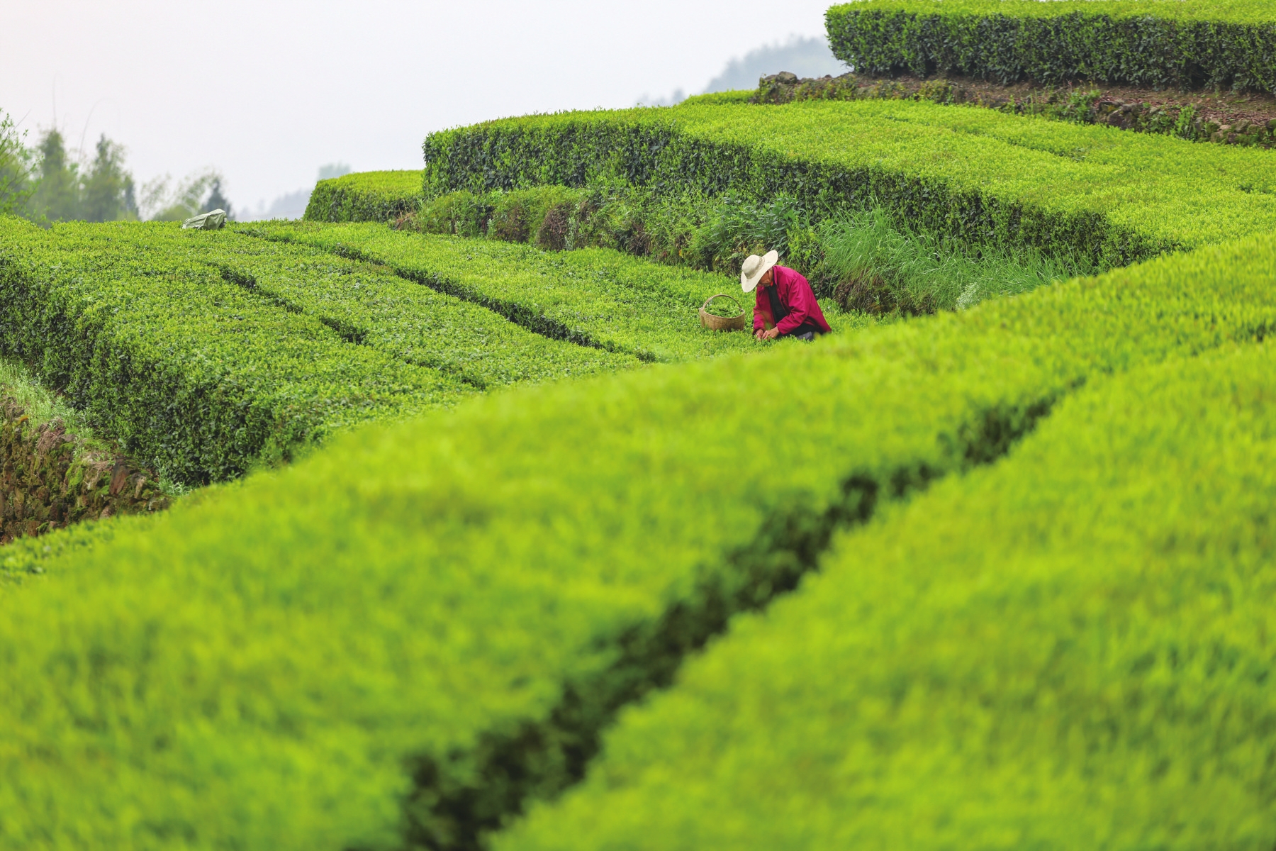 4月8日,点军区双堰口村高水平生态茶园经春雨润泽头,嫩芽饱满鲜嫩,满目新绿缀满枝。茶农抢抓农时,穿梭于茶垄间采摘春茶。(记者林潇 摄)