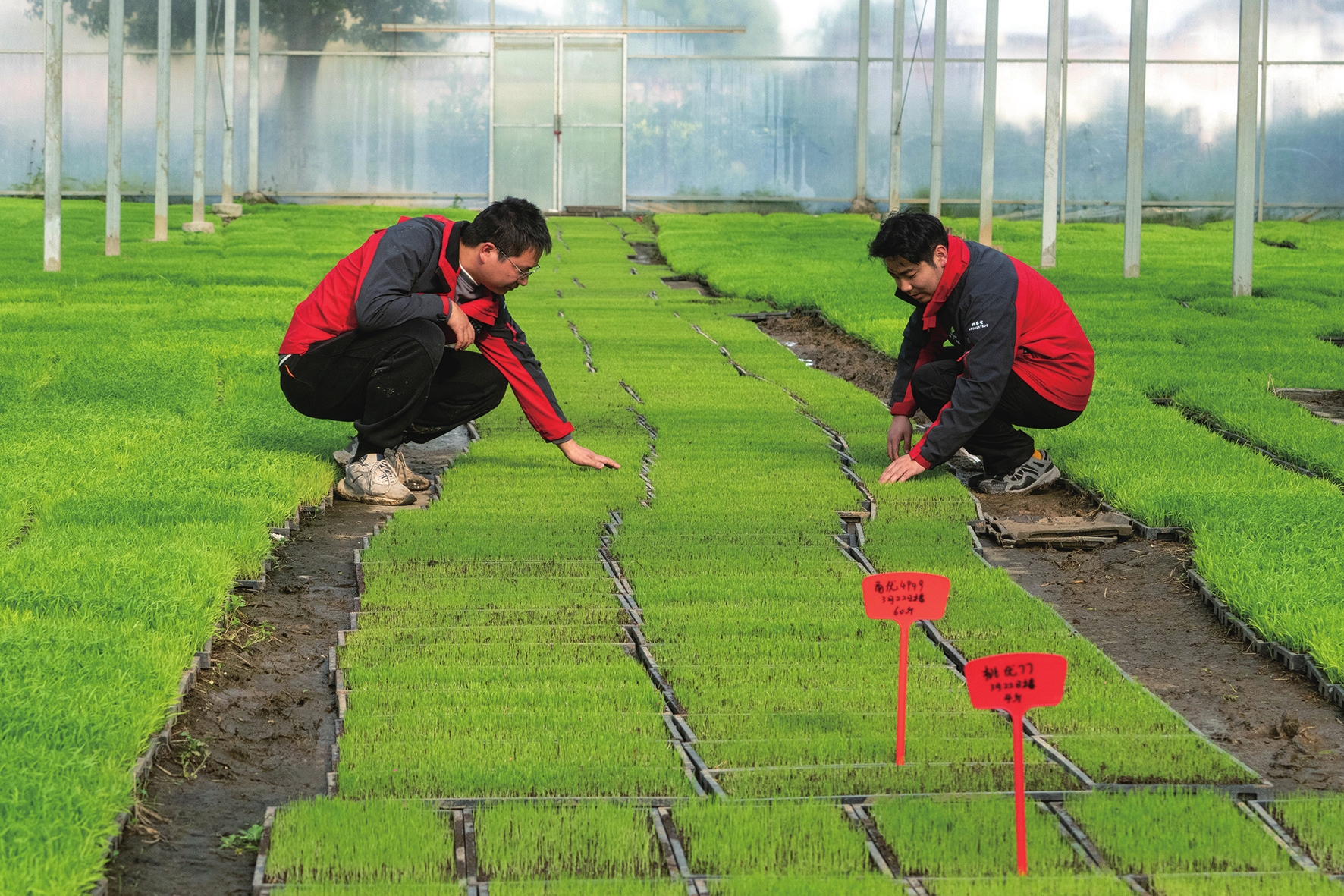4月7日,在枝江市信达农业专业合作社育秧基地,工人正在整理秧盘、检查秧苗长势。据了解,今年该基地第一批5万多盘水稻秧苗已破土而出,预计4月中旬移栽到田里。(记者付蓓蓓、通讯员王悦 摄)