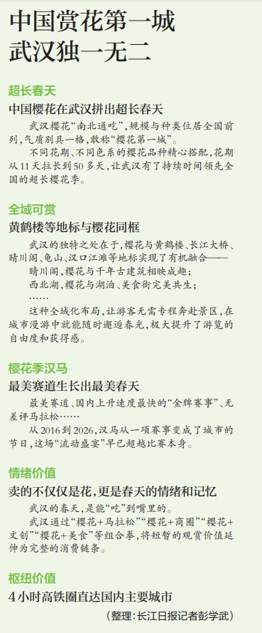 中国旅游研究院武汉分院副院长、中南财经政法大学工商管理学院教授舒伯阳在接受记者专访时指出,武汉樱花持续领跑全国赏花经济的首个关键,在于完成了从“点状景区”向“全域场景”的转变。目前,武汉拥有223处赏樱点、50万株樱花,覆盖从城市公园到街头巷尾、从江湖之滨到地铁站口的各个角落,赏樱周期从传统的10余天延伸至50余天,形成“全时全域”的赏花新格局。