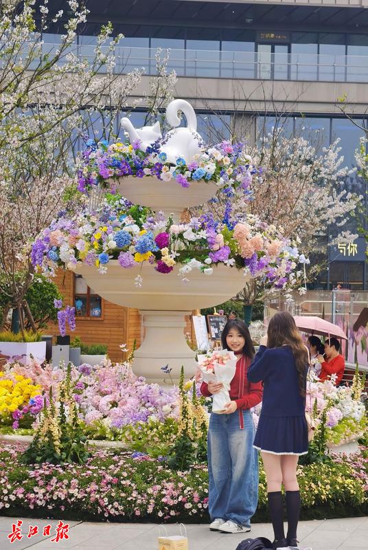 武昌滨江天街将油画中的花园搬进城市商圈,市民在莫奈花园风喷泉间逛街赏游,春日浪漫扑面而来。 记者苗剑摄