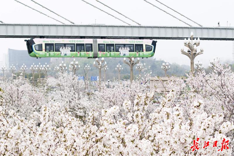 光谷空轨邂逅盛放樱花,赛博赏樱成春日顶流。 记者胡冬冬摄