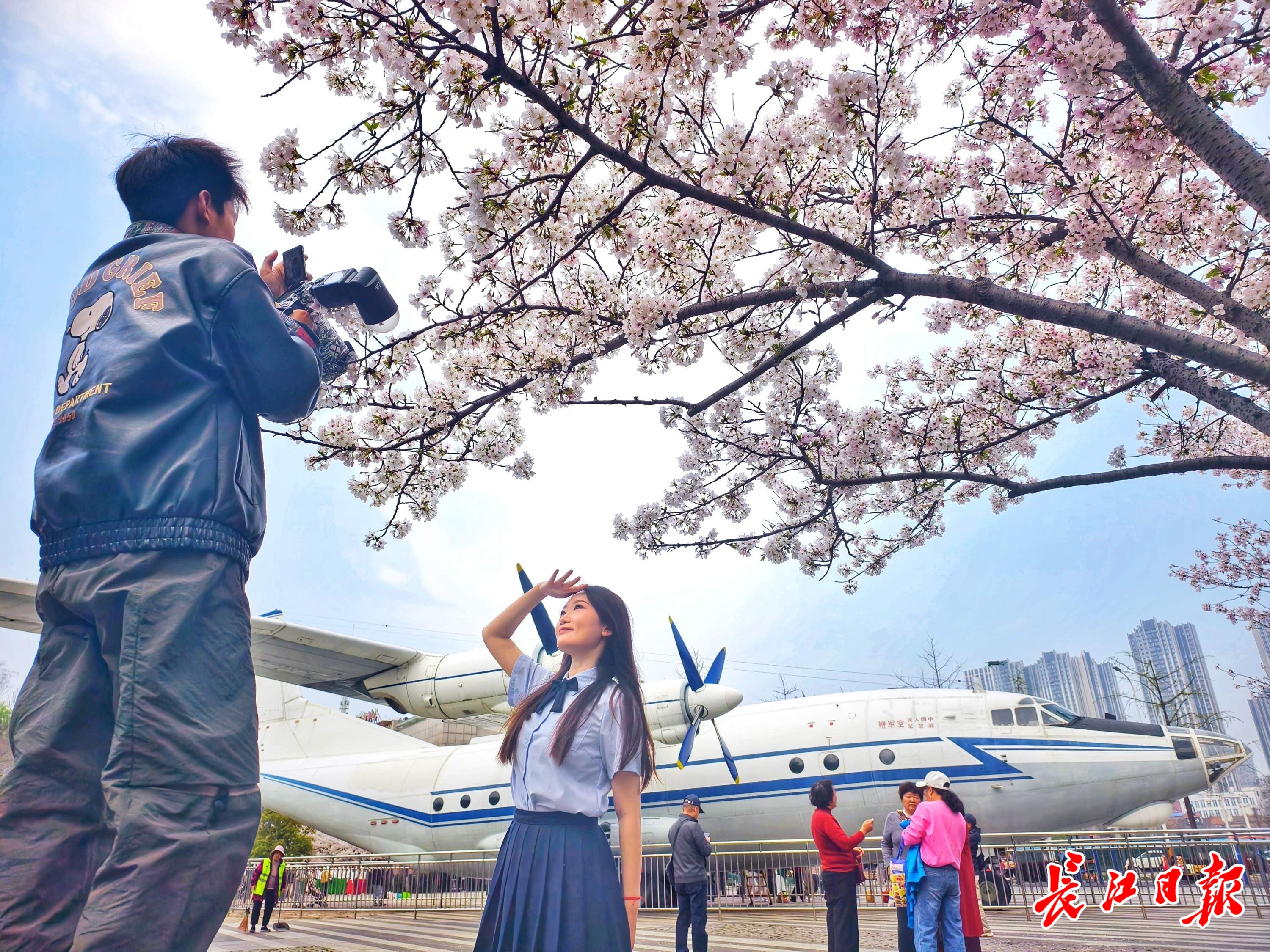 汉口王家墩公园,市民游客在樱花掩映的飞机前拍照。记者苗剑摄
