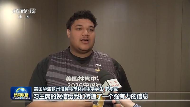 美国华盛顿州塔科马市林肯中学学生 安东尼:习主席的贺信给我们传递了一个强有力的信息,让我们坚信彼此学习、相互理解就能让人心贴得更近。我要把我亲身体验所经历的一切,把我看到的真实的、充满活力的中国,讲给我家乡的朋友们听。