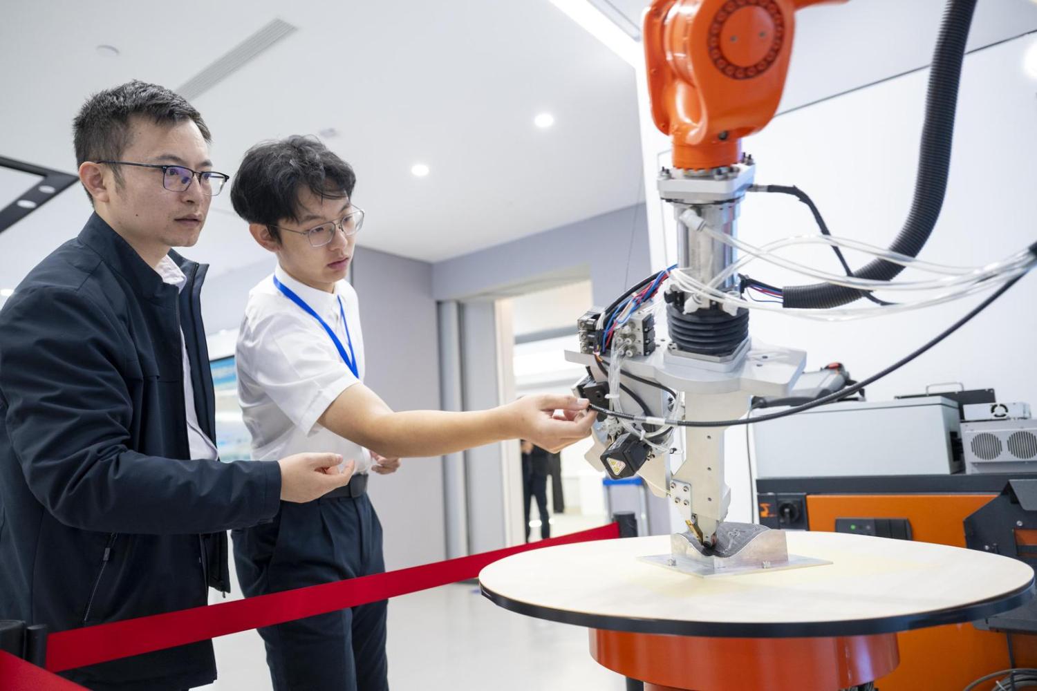 2025年11月6日,在武汉产业创新发展研究院,工作人员展示增材制造机器人。新华社记者伍志尊摄