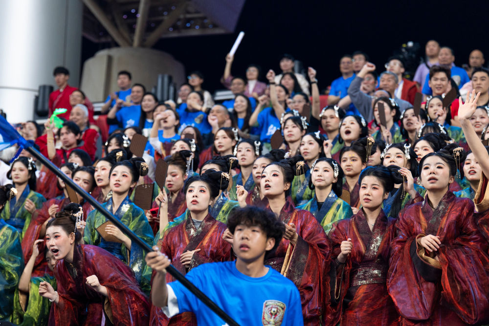 身着战国袍的荆州队球迷在看台上为球队加油助威。新华社记者伍志尊 摄