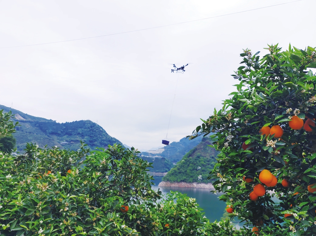 4月15日,秭归沙镇溪镇千将坪村,无人机吊运伦晚脐橙。 (记者胡兴军 摄)