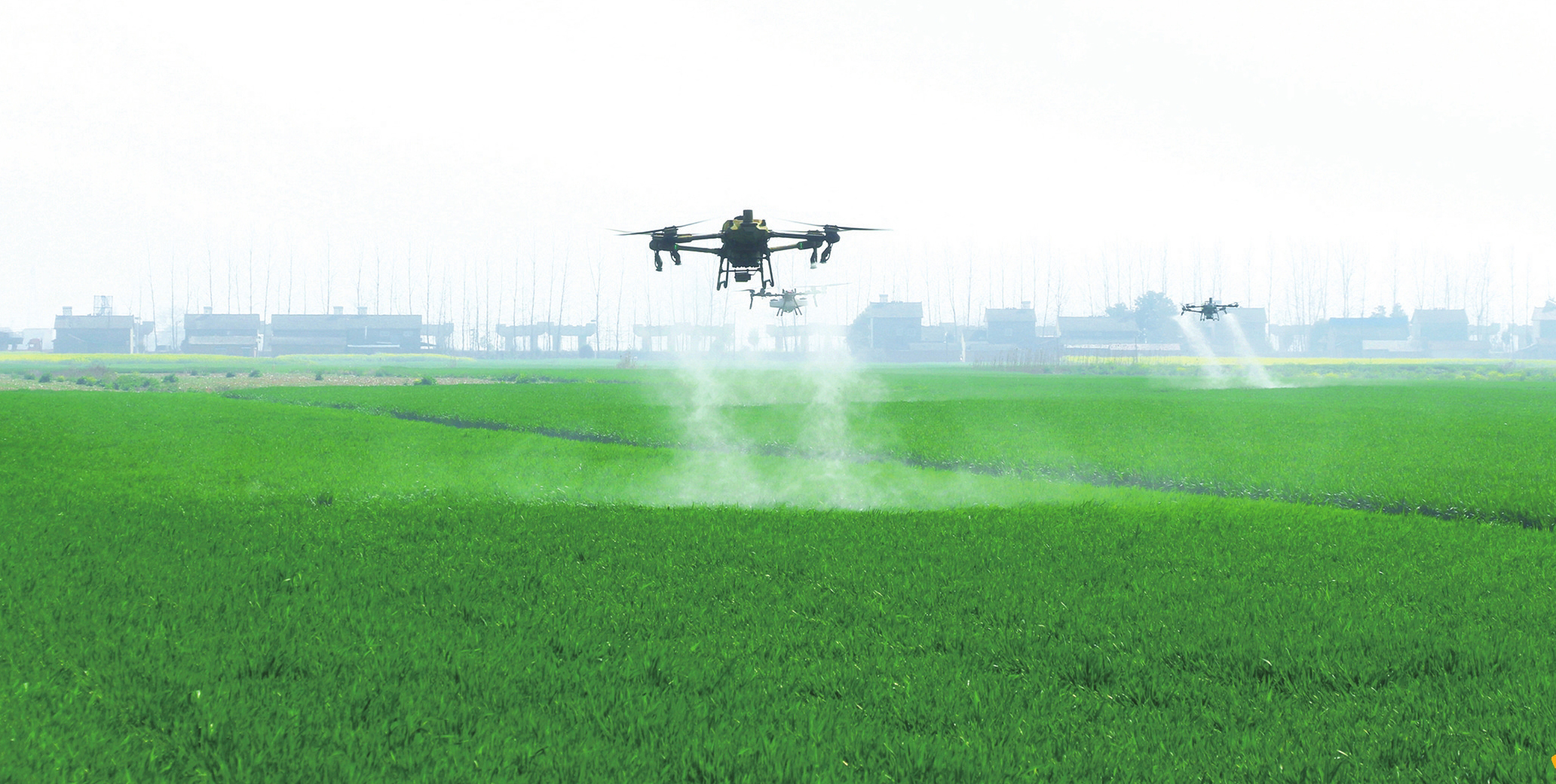 当阳市草埠湖镇,植保无人机精准巡航作业,细密药雾均匀喷洒,以科技守护麦田长势。 (记者张锴、通讯员鲍文喆 摄)