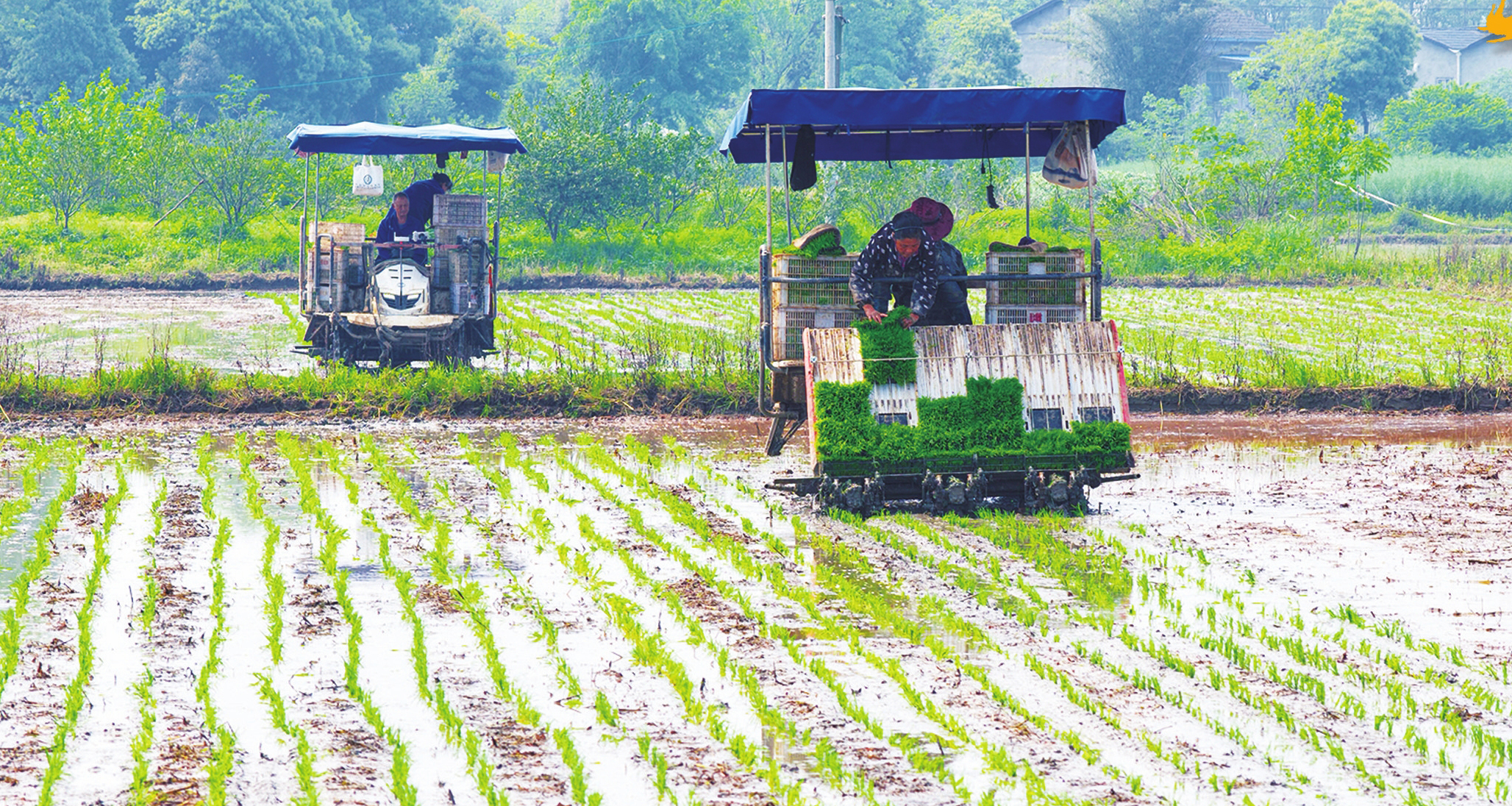 4月16日,枝江市仙女镇田间一派繁忙景象。搭载北斗系统的高速插秧机穿梭作业,农户协同栽插优质再生香稻秧苗。 (记者付蓓蓓、通讯员李怡然 摄)