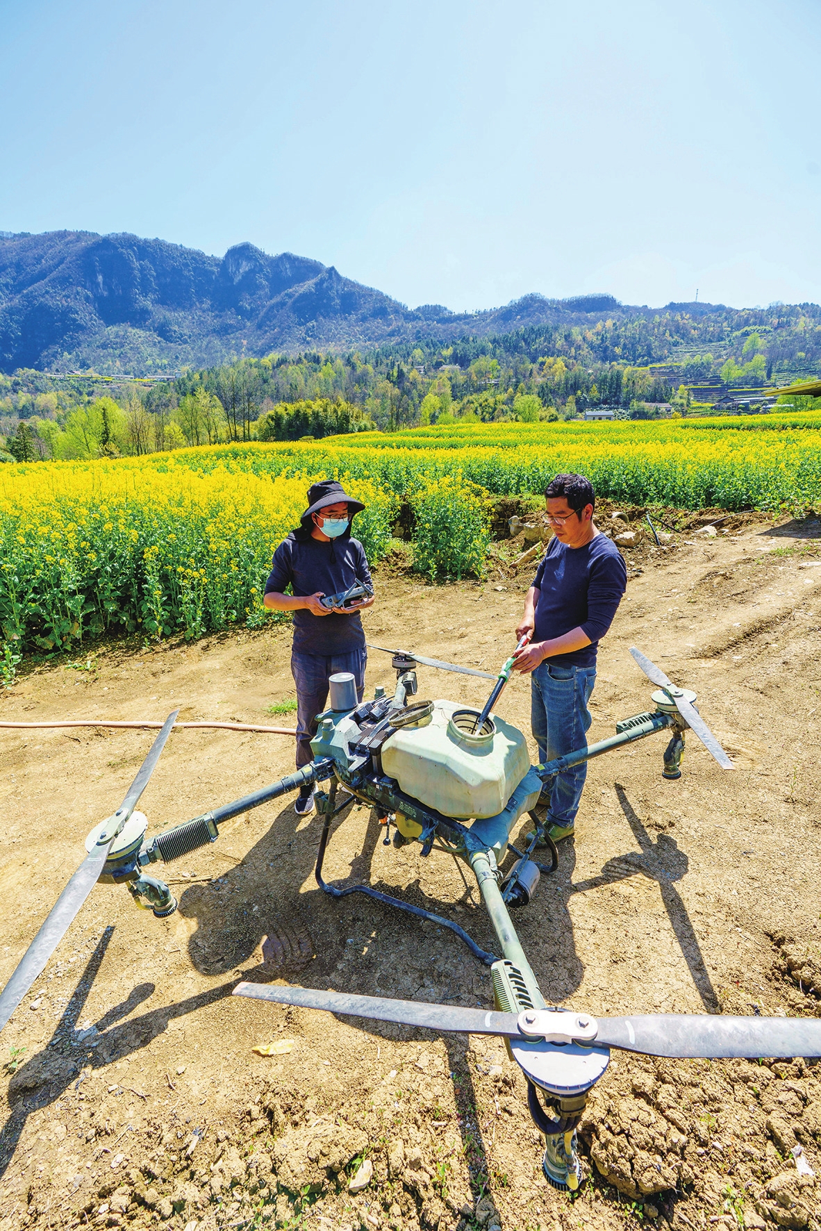 4月1日,秭归县杨林桥镇农技人员操控无人机开展油菜统防统治。(通讯员周仕伟 摄)