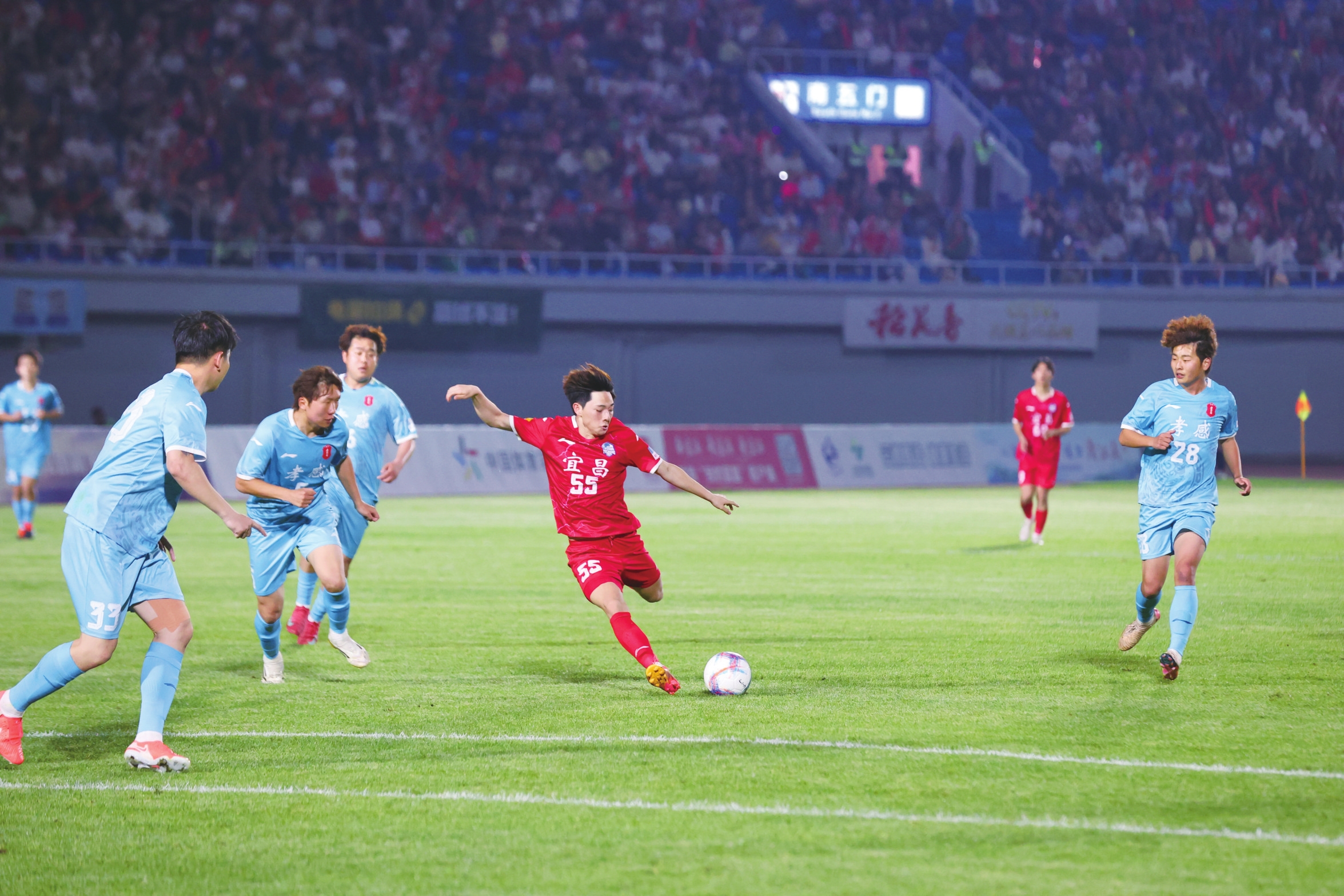 4月18日晚,宜昌市体育场华灯璀璨、人声鼎沸。2026年湖北省城市足球联赛(以下简称“楚超”)宜昌赛区揭幕战在此打响。经过90分钟鏖战,宜昌东阳光队主场以2:0击败孝感孝傲江湖队,取得开门红。来自省内外的1.4万多名球迷齐聚一堂,共同见证了“楚超”宜昌赛区的揭幕战。