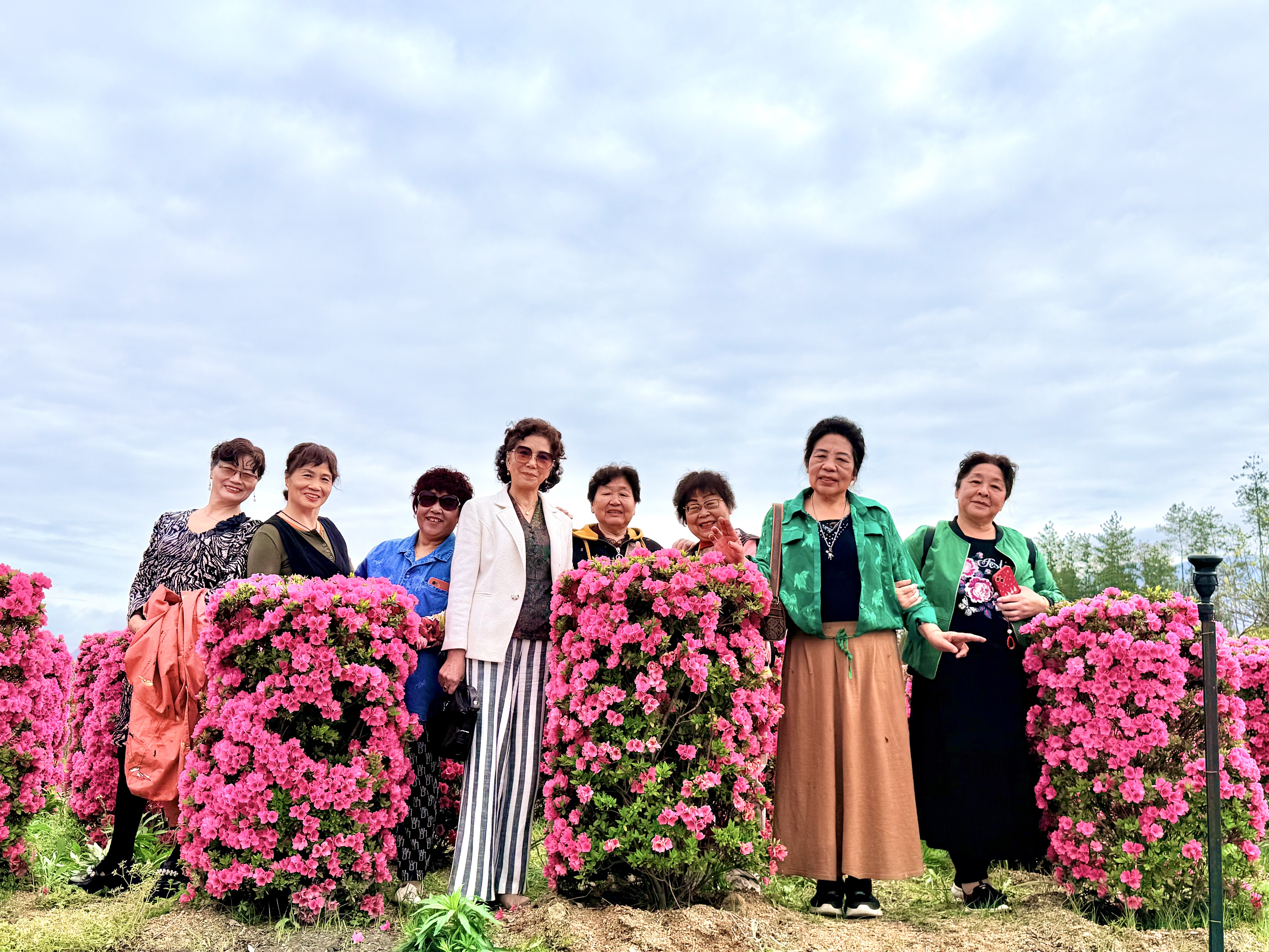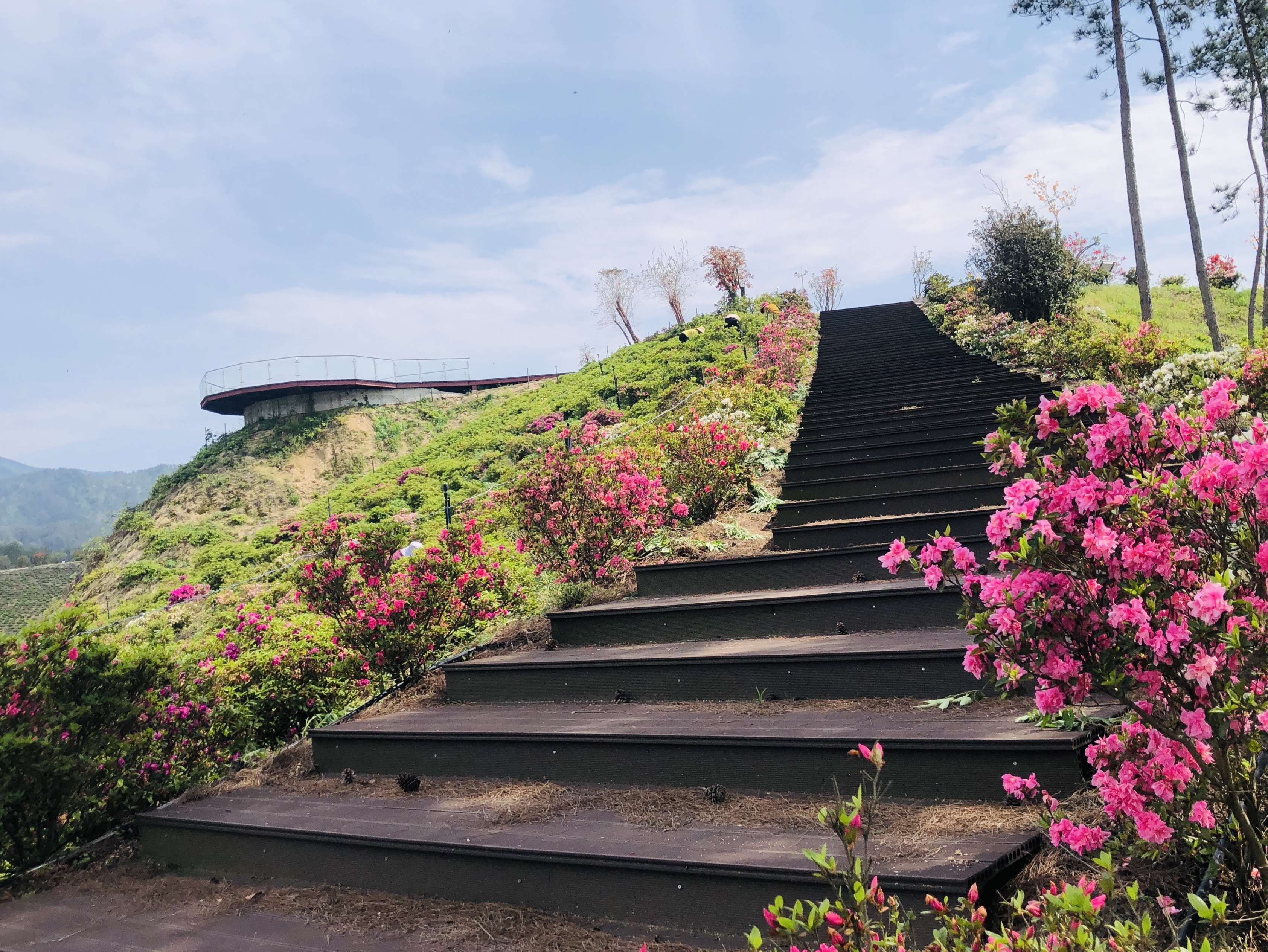 从山脚到花海深处,路面平坦得几乎感觉不到坡度。每走百来米,路边就有一把休息椅。到了观景台,护栏的高度正好适合她扶靠。杜鹃花开得正盛,粉的、红的、紫的,像打翻了颜料盘。