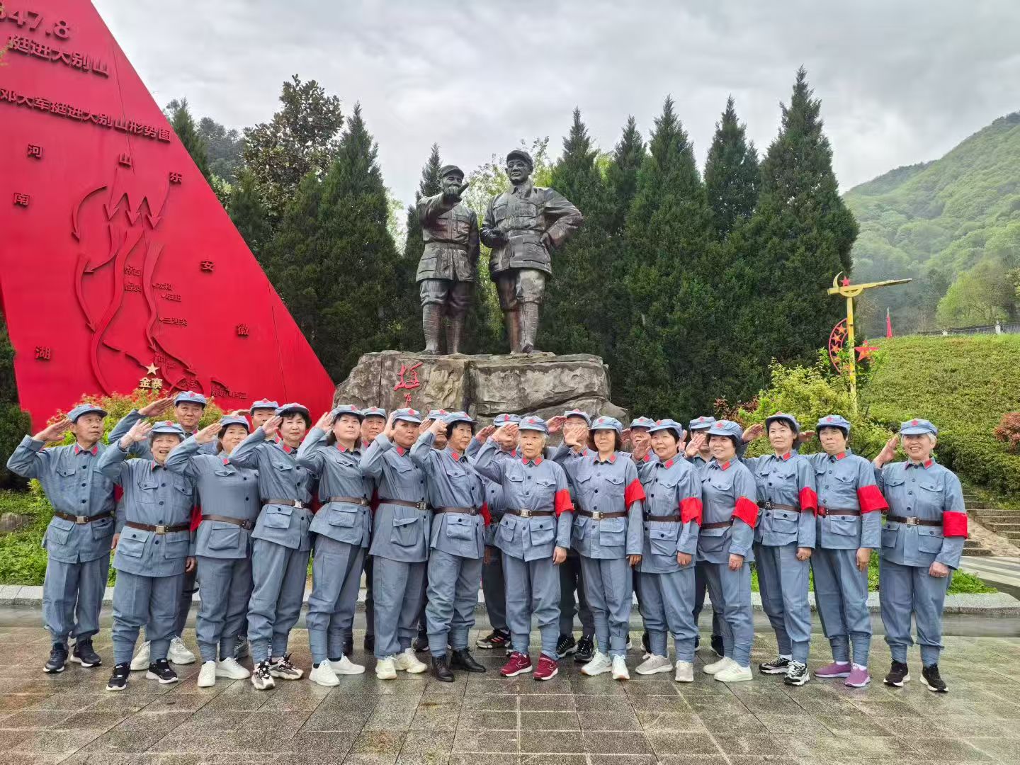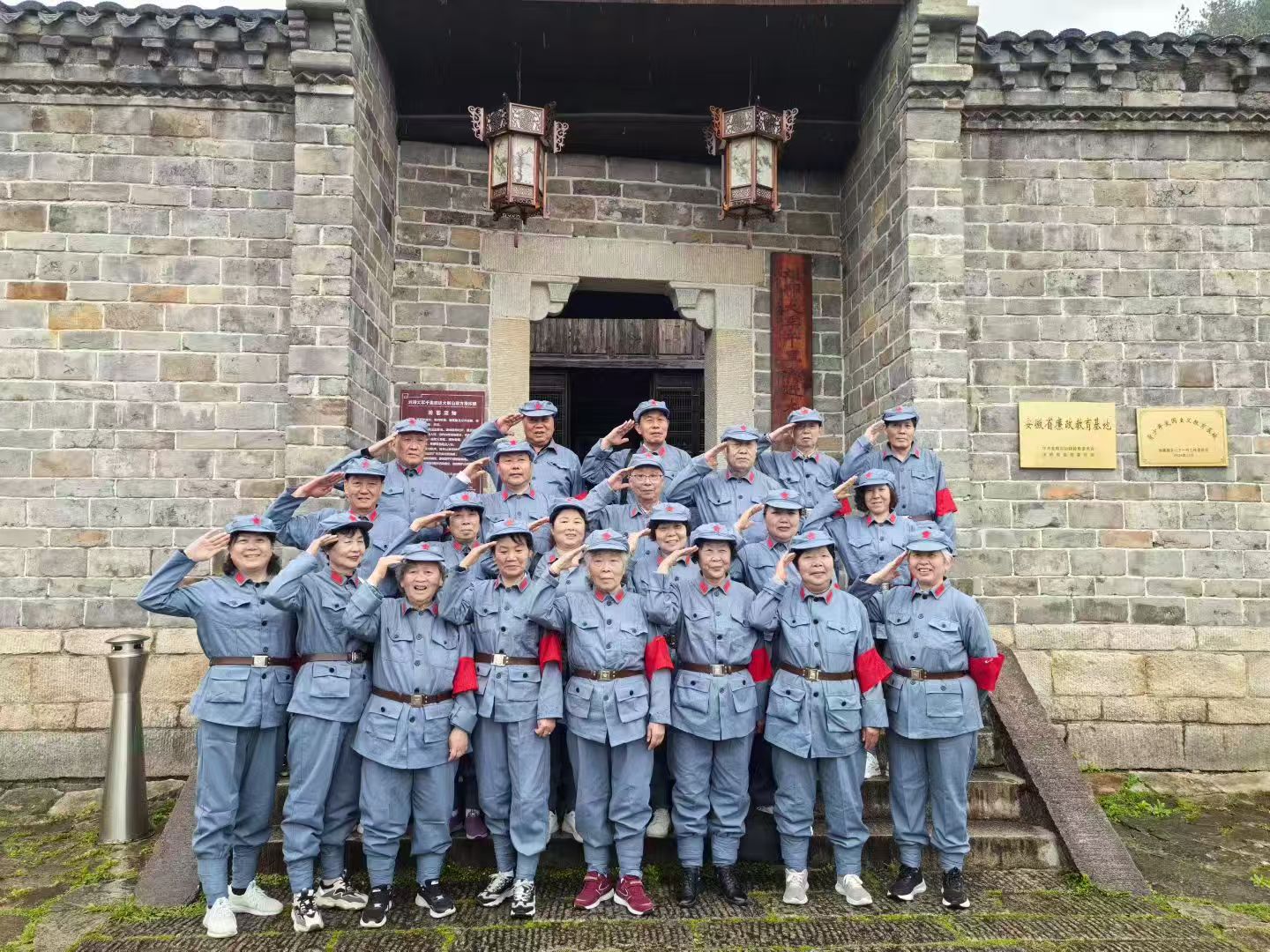 刘邓大军指挥部旧址前,十多位身穿红军服的老人举起右拳。阳光从老樟树的缝隙里漏下来,落在他们花白的头发上。