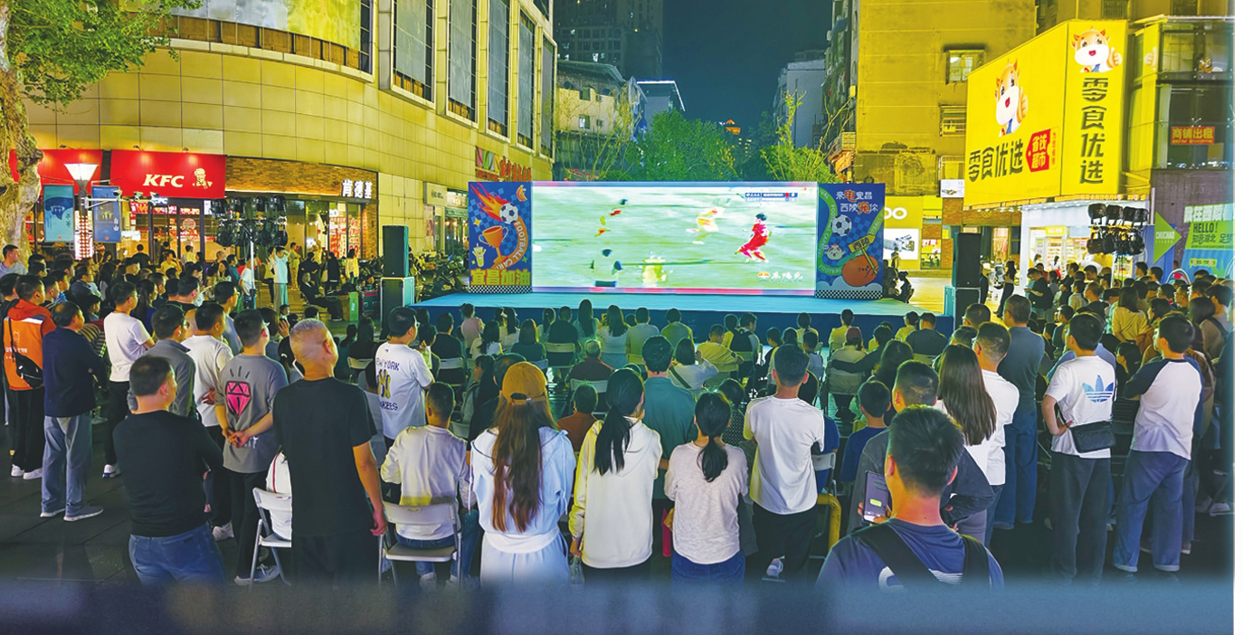 市民在解放路步行街观看比赛直播。