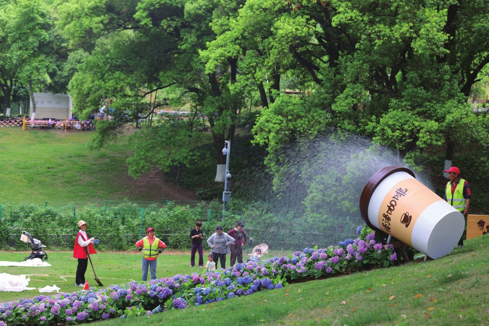 4月17日,宜昌城区运河公园,园林工作人员正在布置花展,以迎接即将到来的“五一”假期。(记者吴延陵 摄)