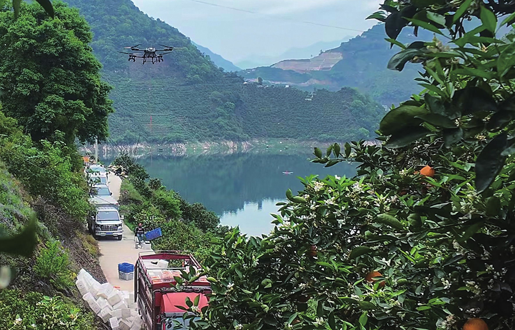 谭龙飞曾在外地从事无人机航拍工作,敏锐捕捉到家乡低空经济的发展潜力后,他毅然返乡,发挥专长从事无人机服务业务。“在采摘旺季,我和团队成员用一台无人机一天最多可以吊运2万多公斤橙子。”