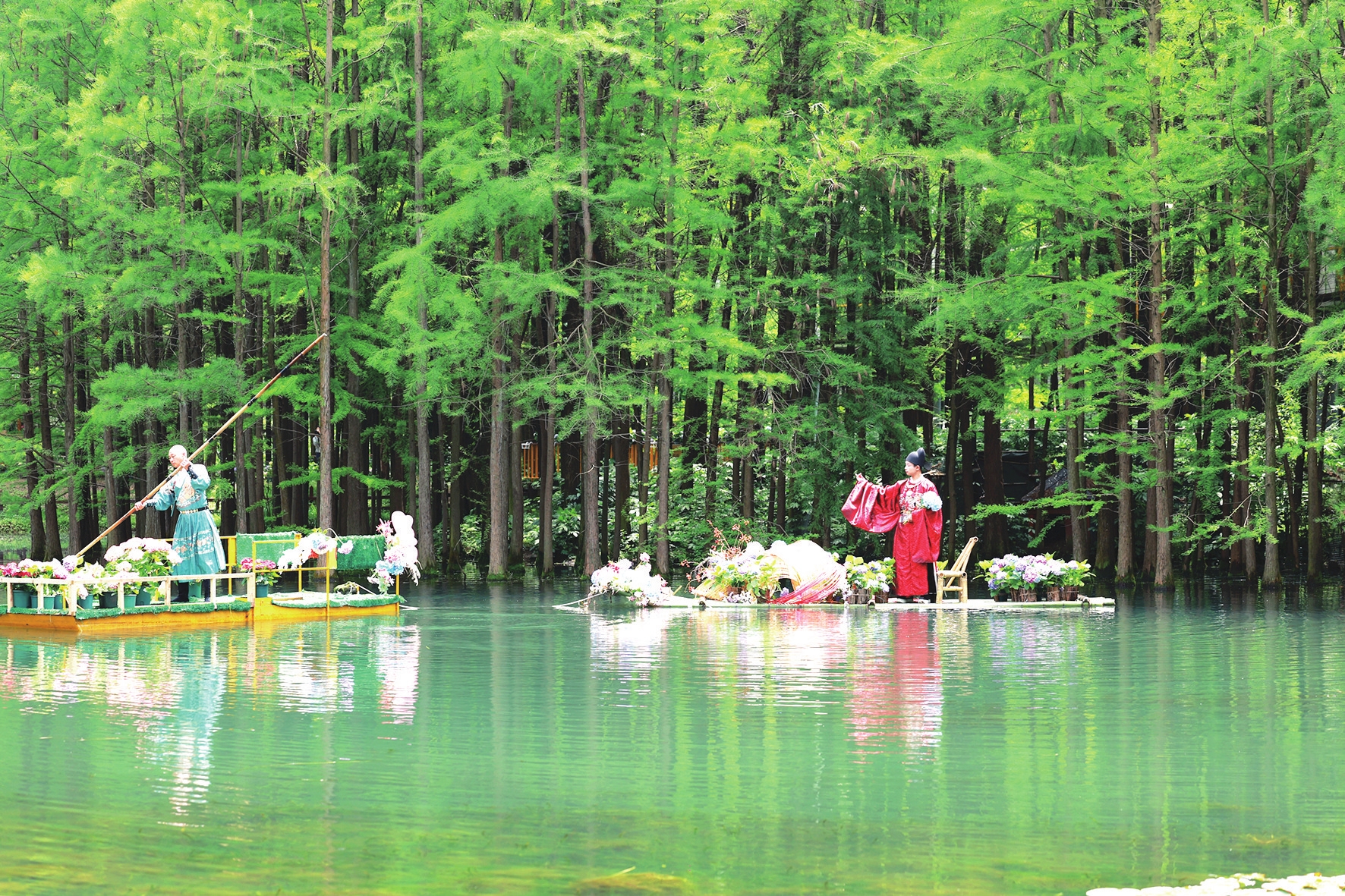 4月22日,宜昌城区运河公园,一位汉服爱好者乘花船在湖面巡游,吸引许多游客驻足拍照。本周末运河公园第五届绣球花展将正式拉开帷幕,花展以“一城花开・绣染清夏”为主题,不仅在陆地打造了19处特色景观节点,更首次将绣球花展延伸至水面,让绣球花与运河水景相映成趣,营造出“水上花园”的浪漫意境。(记者黄翔 摄)
