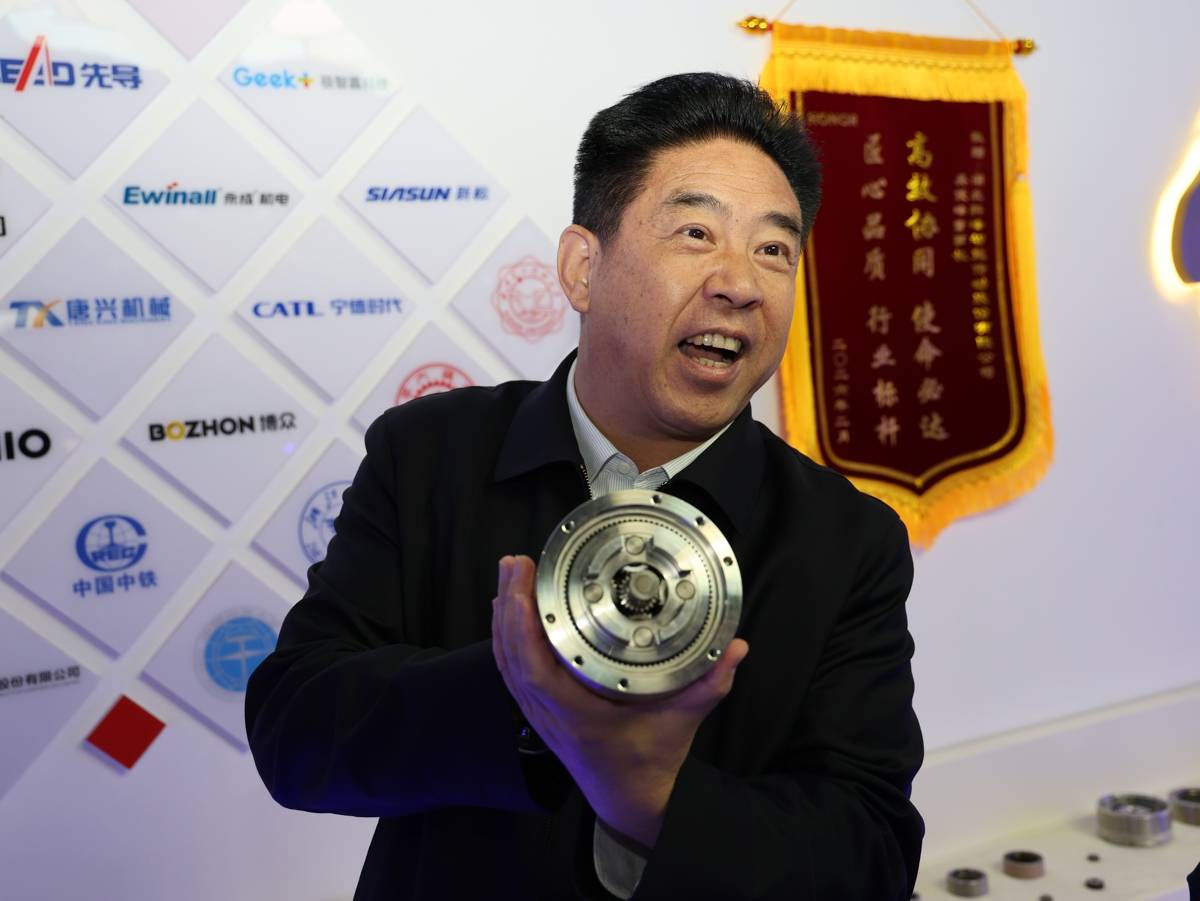 科峰传动董事长吴俊峰在展示机器人关节模组零件。(湖北日报全媒记者刘毅摄)