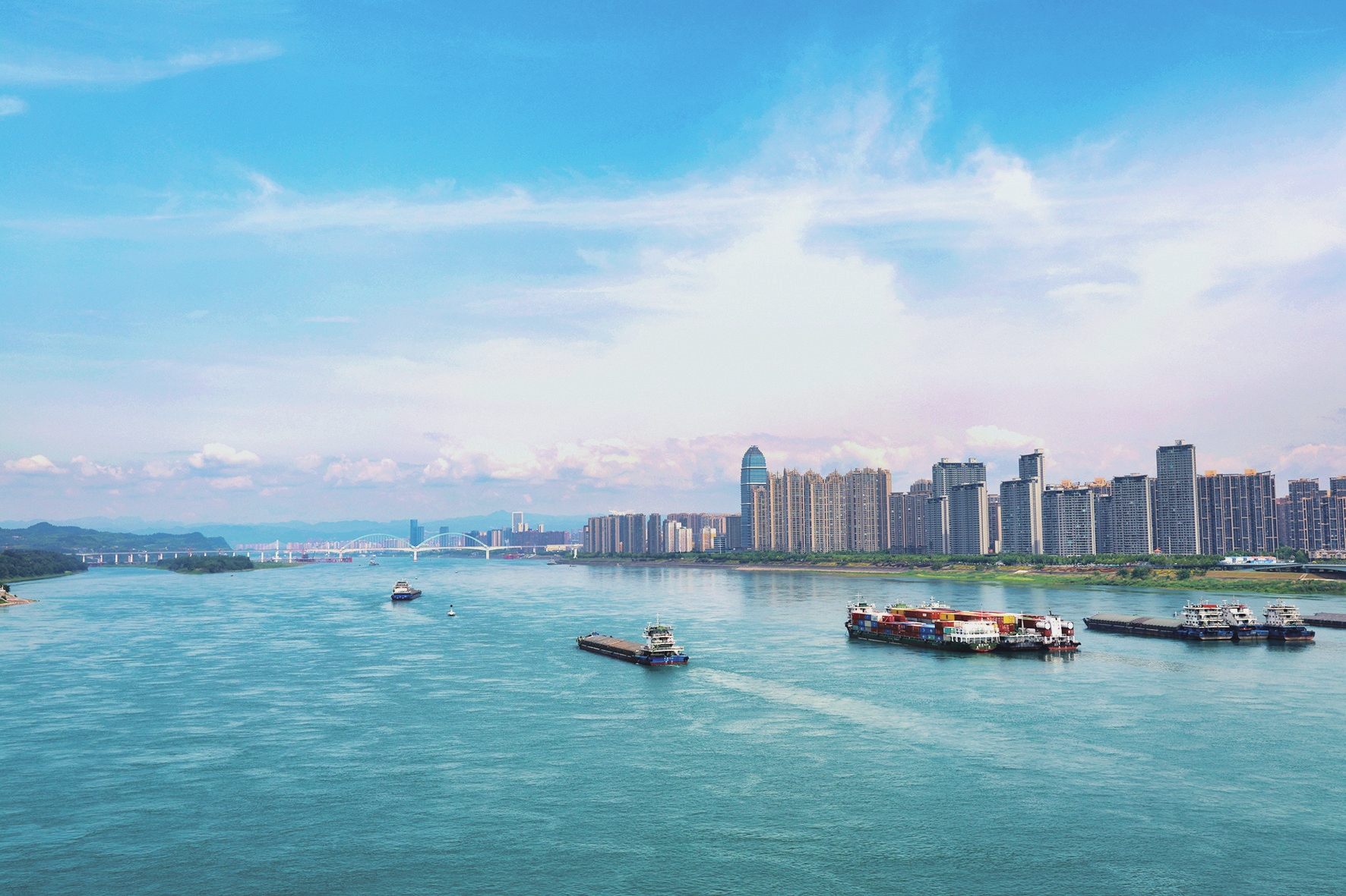 4月23日,宜昌长江岸线水清岸绿、船行江中,宛如一幅美丽的生态画卷。 (记者黄翔 摄)