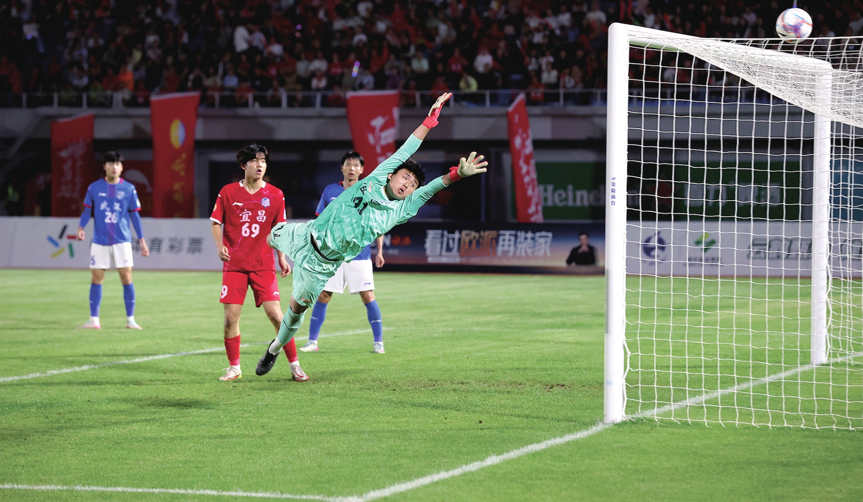 比赛中,宜昌东阳光队守门员林天翔完成多次关键扑救。(记者周卓然 摄)