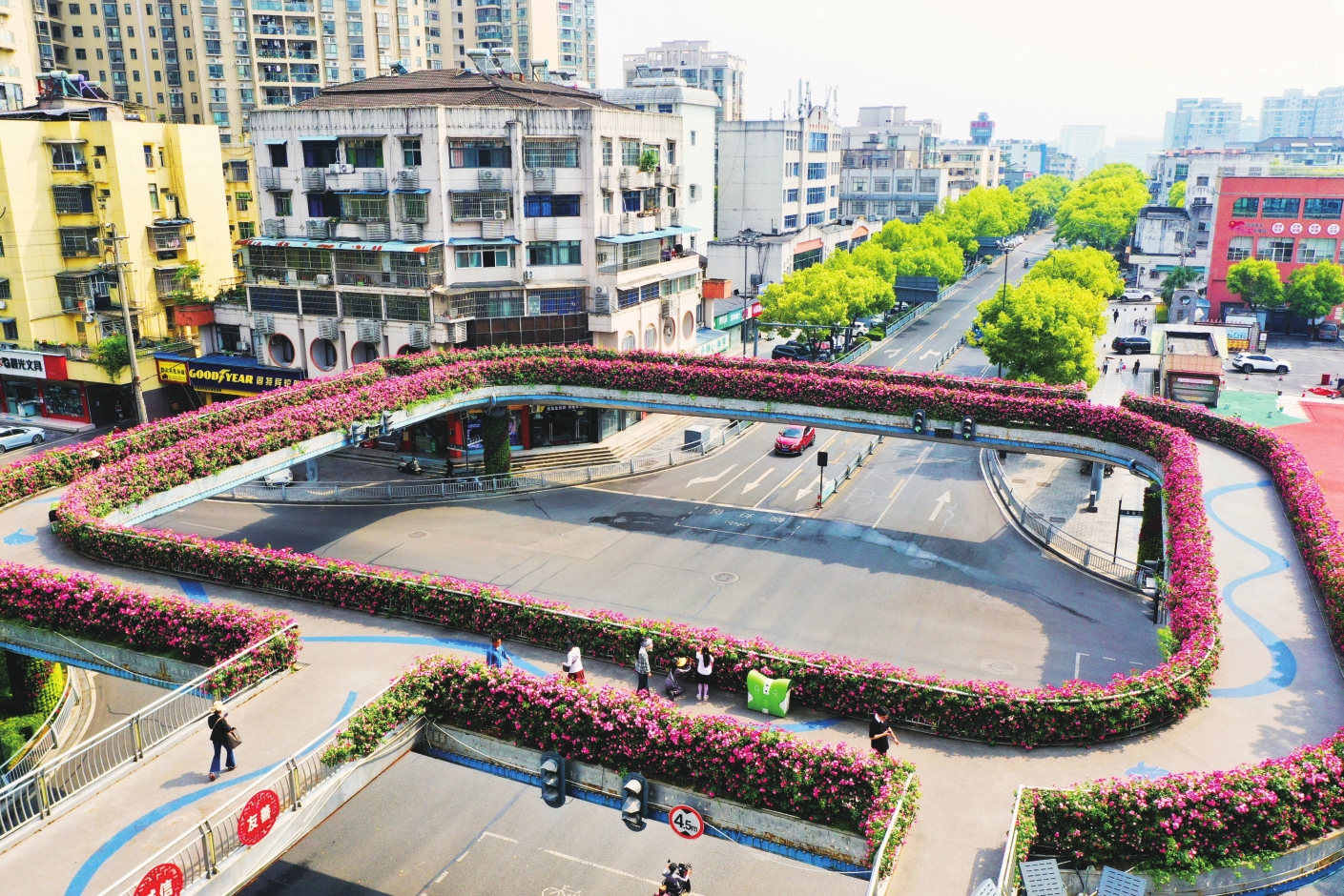 4月26日,夷陵区平云二路天桥护栏上月季花盛开,形成“空中花廊”景观,为城市空间增添了浪漫与生机。 (记者黄翔 摄)