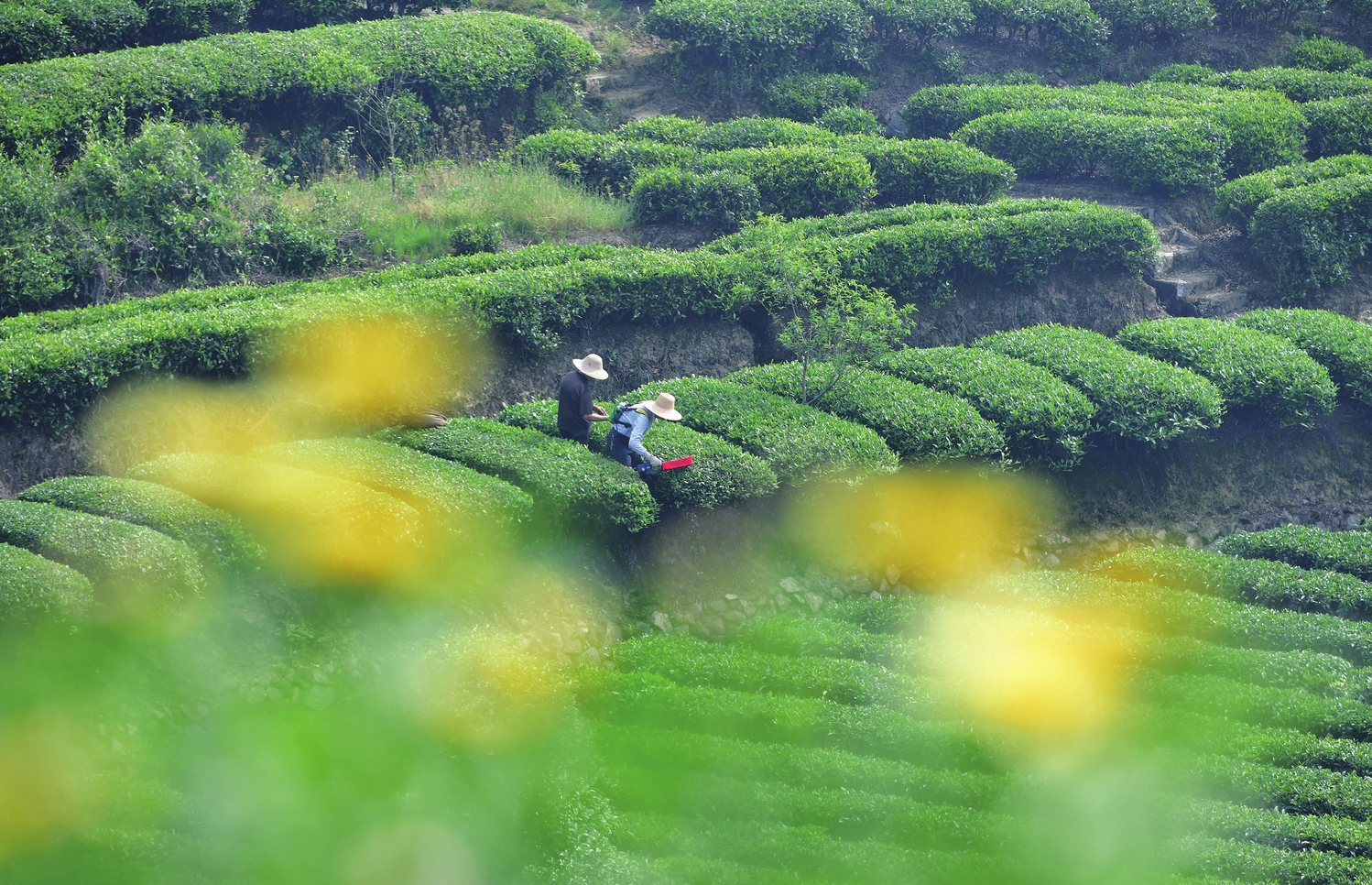 4月26日,茶农在秭归县茅坪镇一生态茶园里采摘春茶。暮春时节,祖国大地从南到北,田间地头,随处可见农民进行春耕生产的勤劳身影。