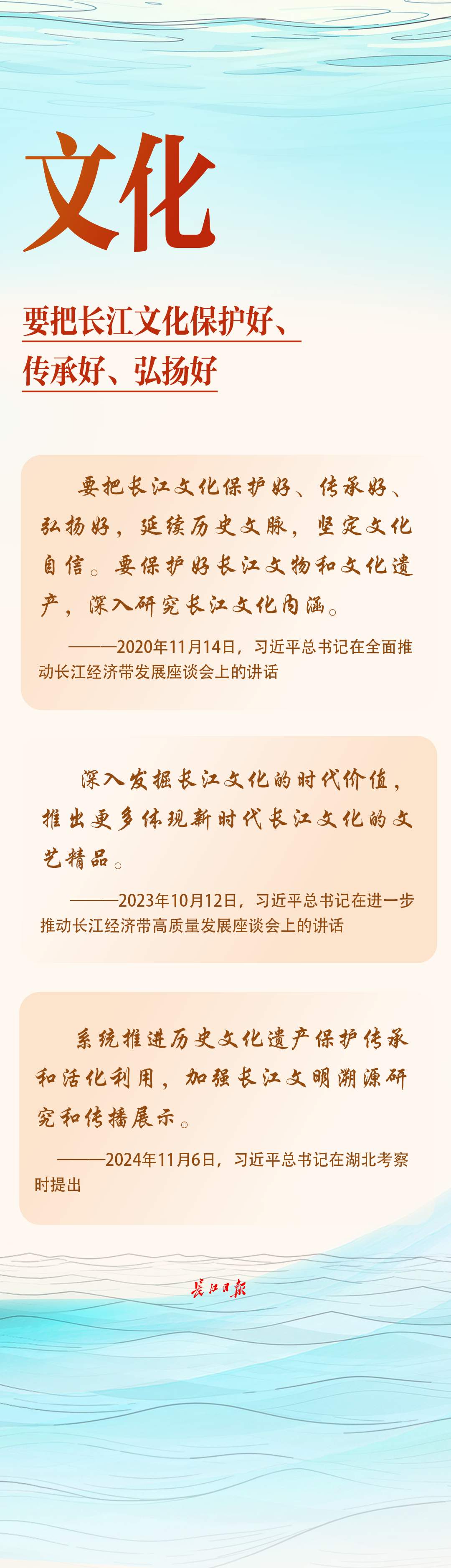 “要把长江文化保护好、传承好、弘扬好,延续历史文脉,坚定文化自信。”