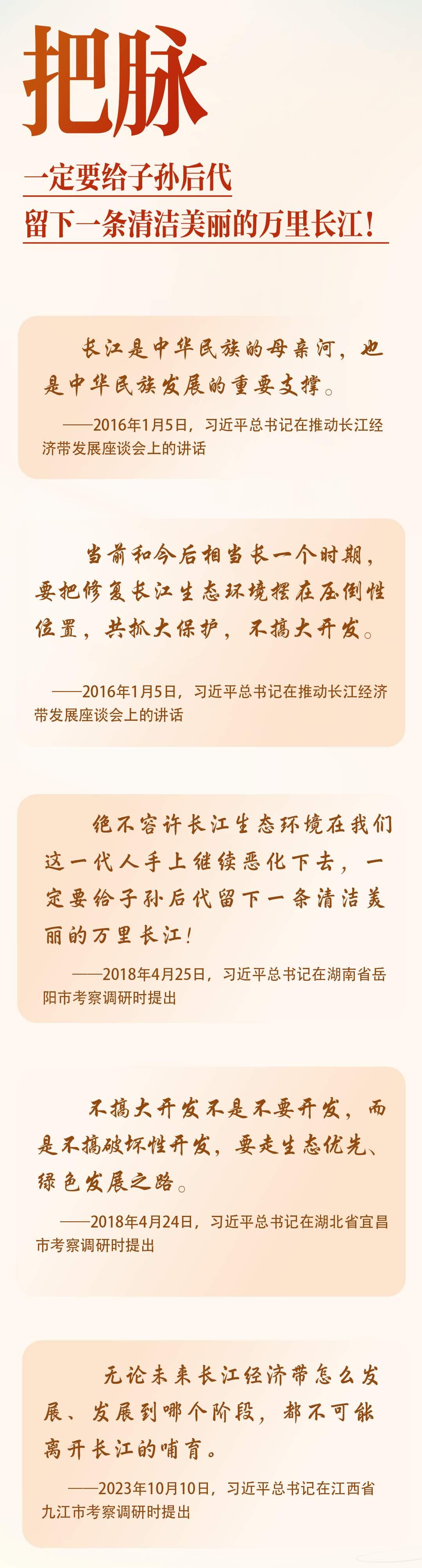 对这条大河,习近平总书记念兹在兹。10年前,首次提出“共抓大保护、不搞大开发”;8年前,在武汉主持召开座谈会,嘱托“守护好一江碧水”。