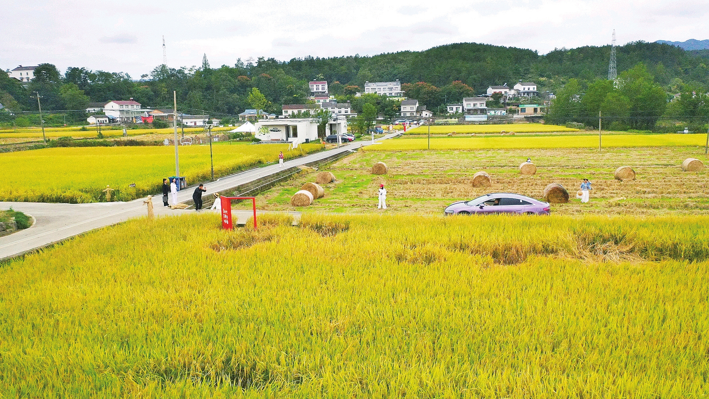 9月22日,夷陵区分乡镇南垭村村民正在进行中稻收割,金黄色的稻穗随风摇曳,吸引了许多游客前来打卡,分享收获的喜悦。